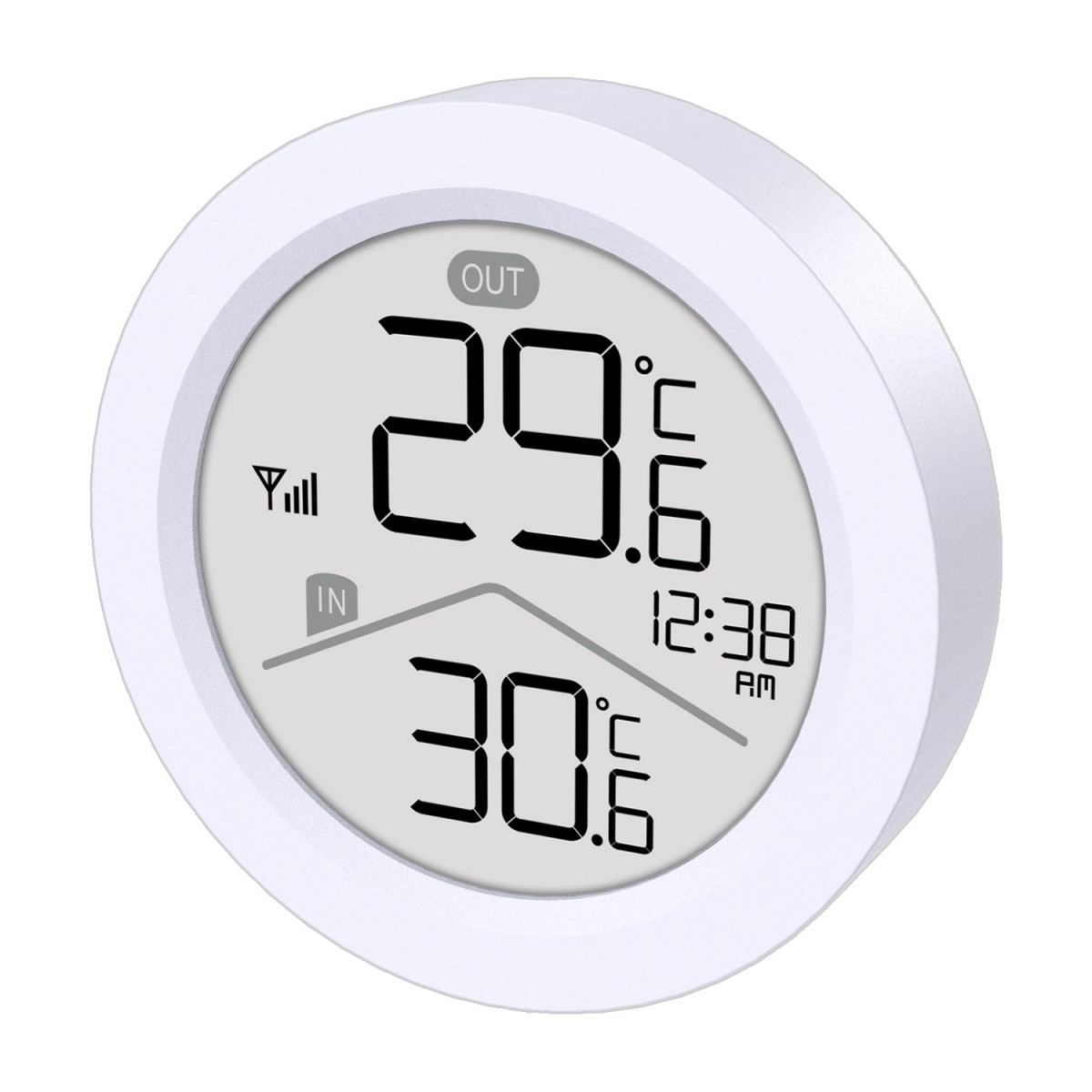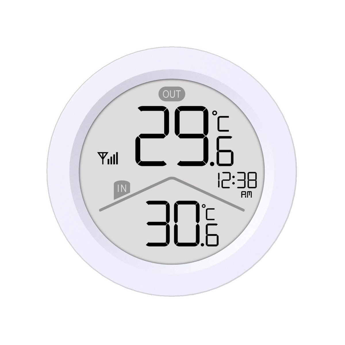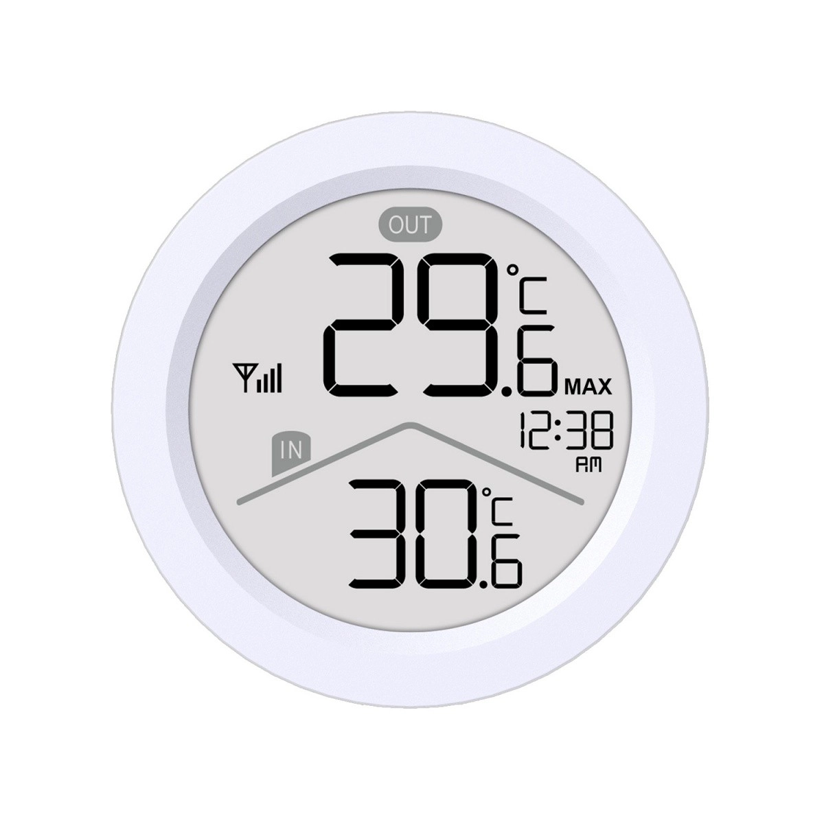 - LCD s velkými číslicemi, indikace IN/OUT, čas, ikona signálu