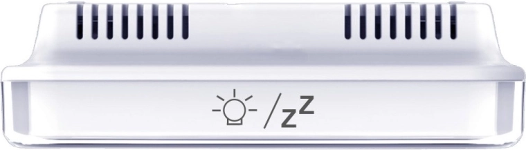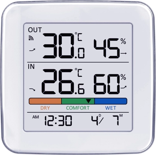 Velký LCD zároveň zobrazuje vnitřní a venkovní teplotu a vlhkost, doplněné o barevnou škálu komfortu pro rychlé vyhodnocení prostředí.