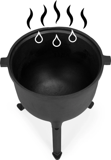 Pevný litinový kotlík se stojanem a víkem je jako stvořený pro venkovní vaření. Kouřovodný otvor ve víku pomáhá regulovat páru a kontrolovat proces.