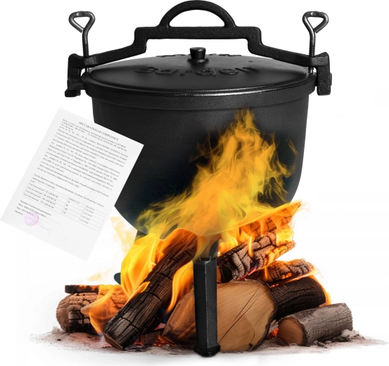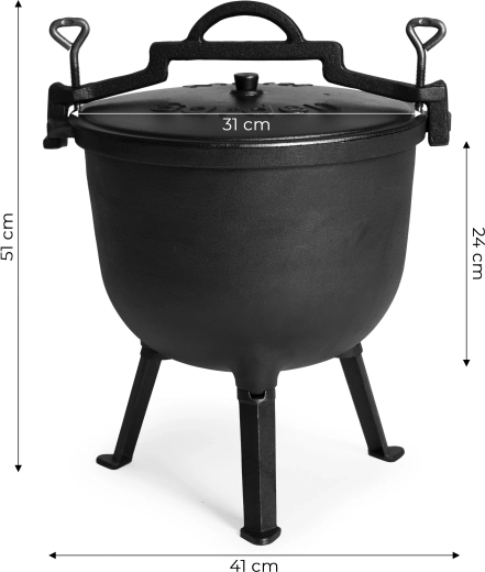 Robustní litinový kotlík o objemu 15 l je ideální pro vaření na otevřeném ohni, zahradní posezení i kempování. Díky litině skvěle akumuluje a rovnoměrně rozvádí teplo, hodí se pro pomalu tažené guláše, polévky i pečení. Součástí je víko, stojan a praktické ucho pro bezpečné přenášení. Odnímatelné nožky usnadní transport a po sejmutí umožní použití i na plynovém sporáku.