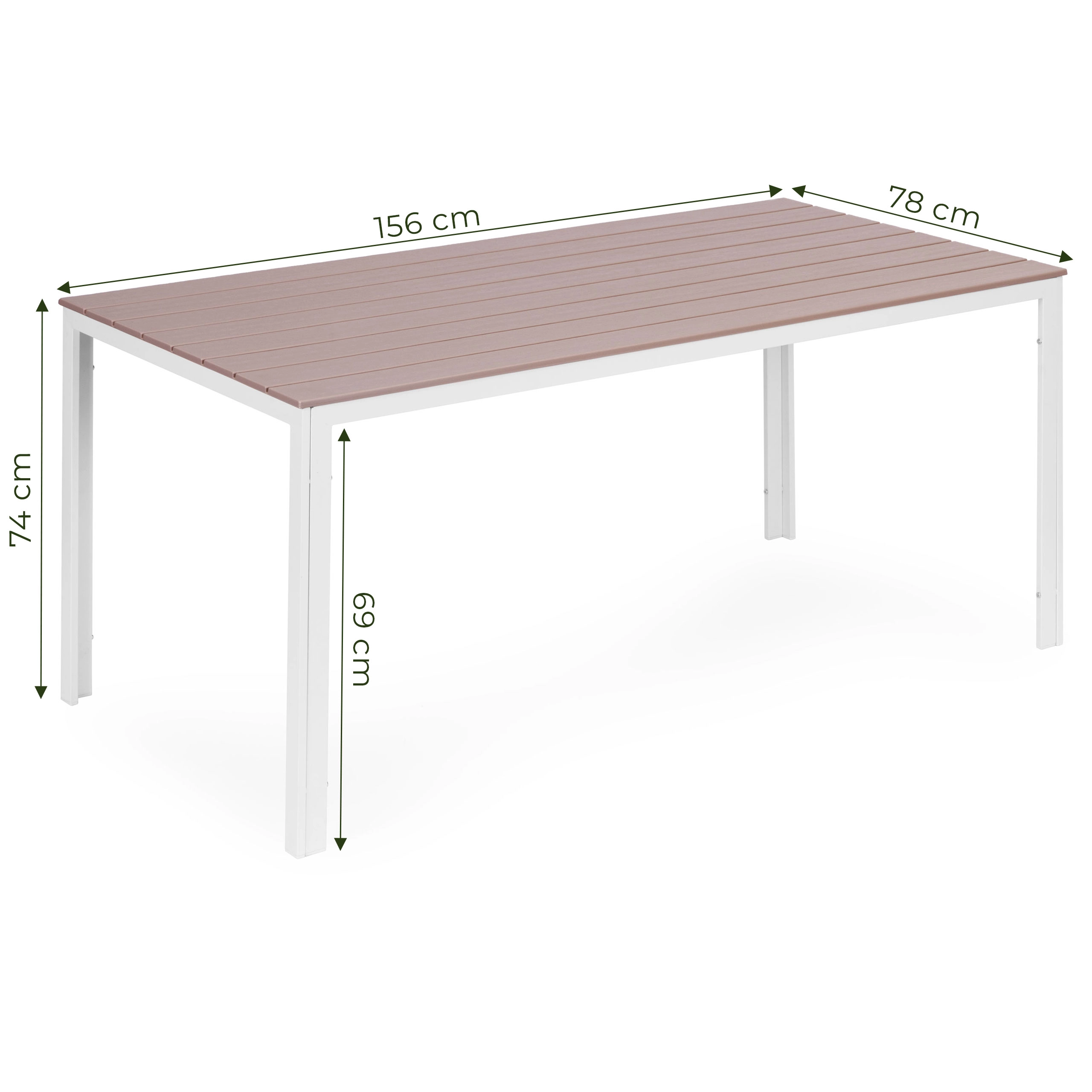 Rozměry 156 × 78 cm poskytují dostatek místa pro rodinné večeře, grilování i setkání s přáteli. Lamelová konstrukce napomáhá odtoku vody a udržuje povrch suchý.