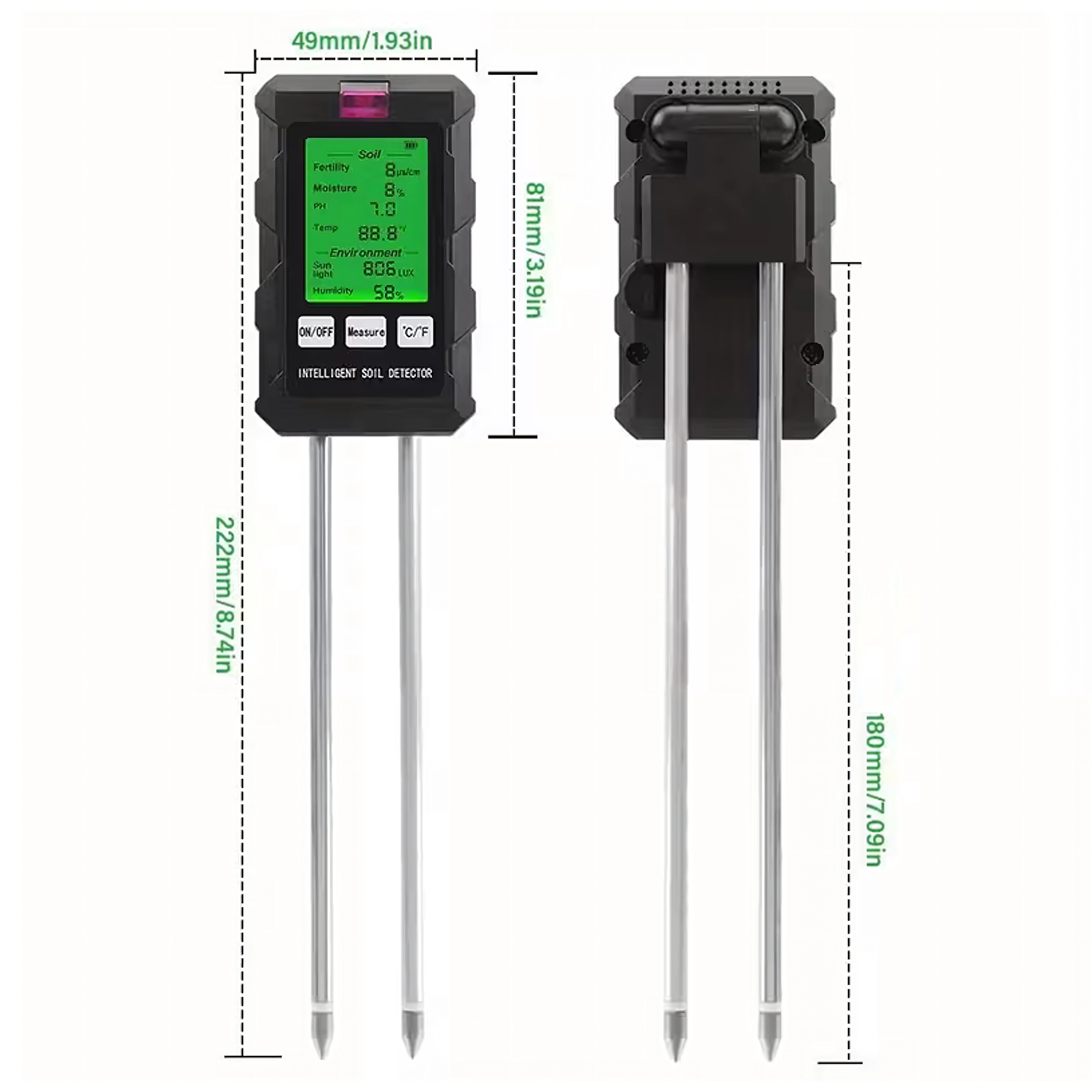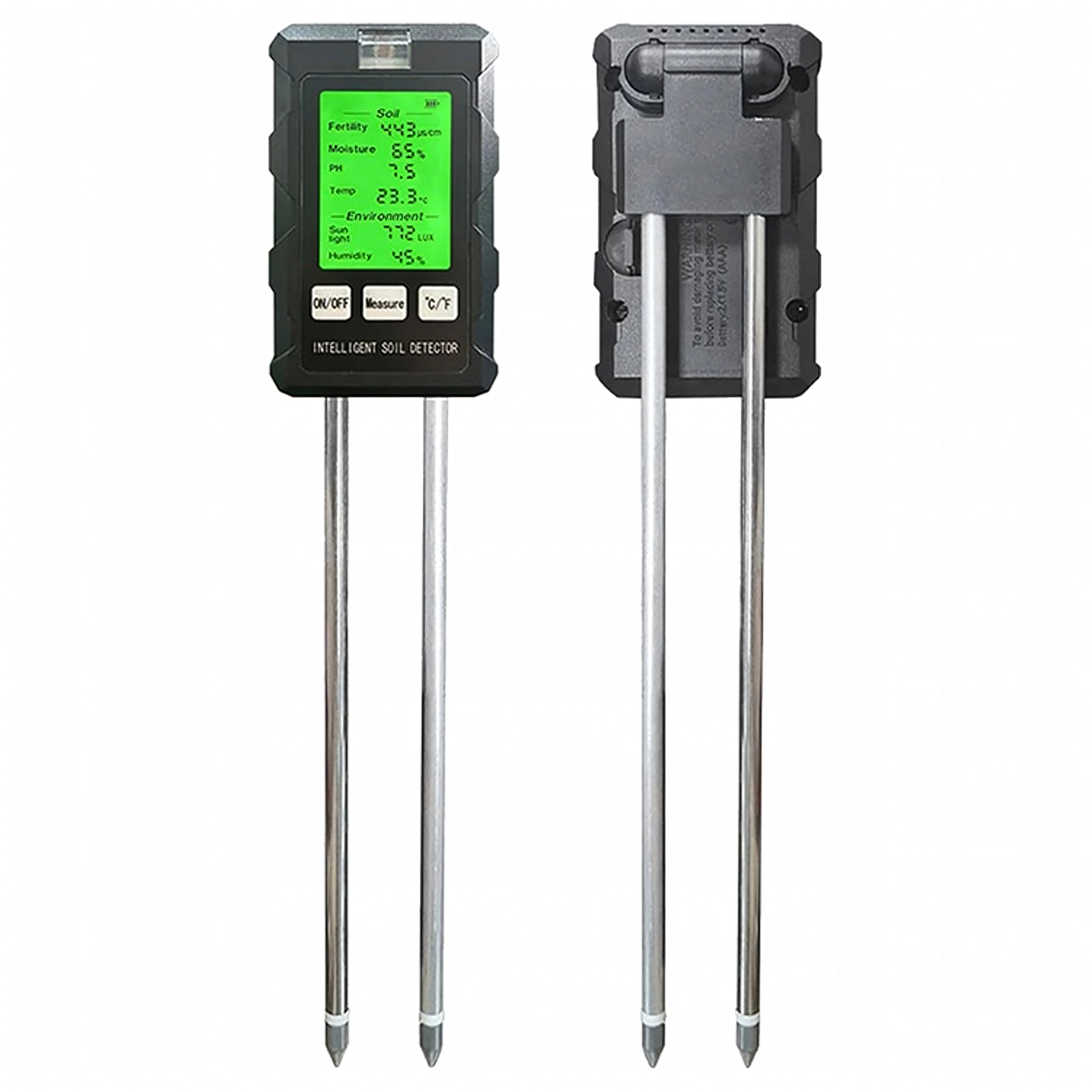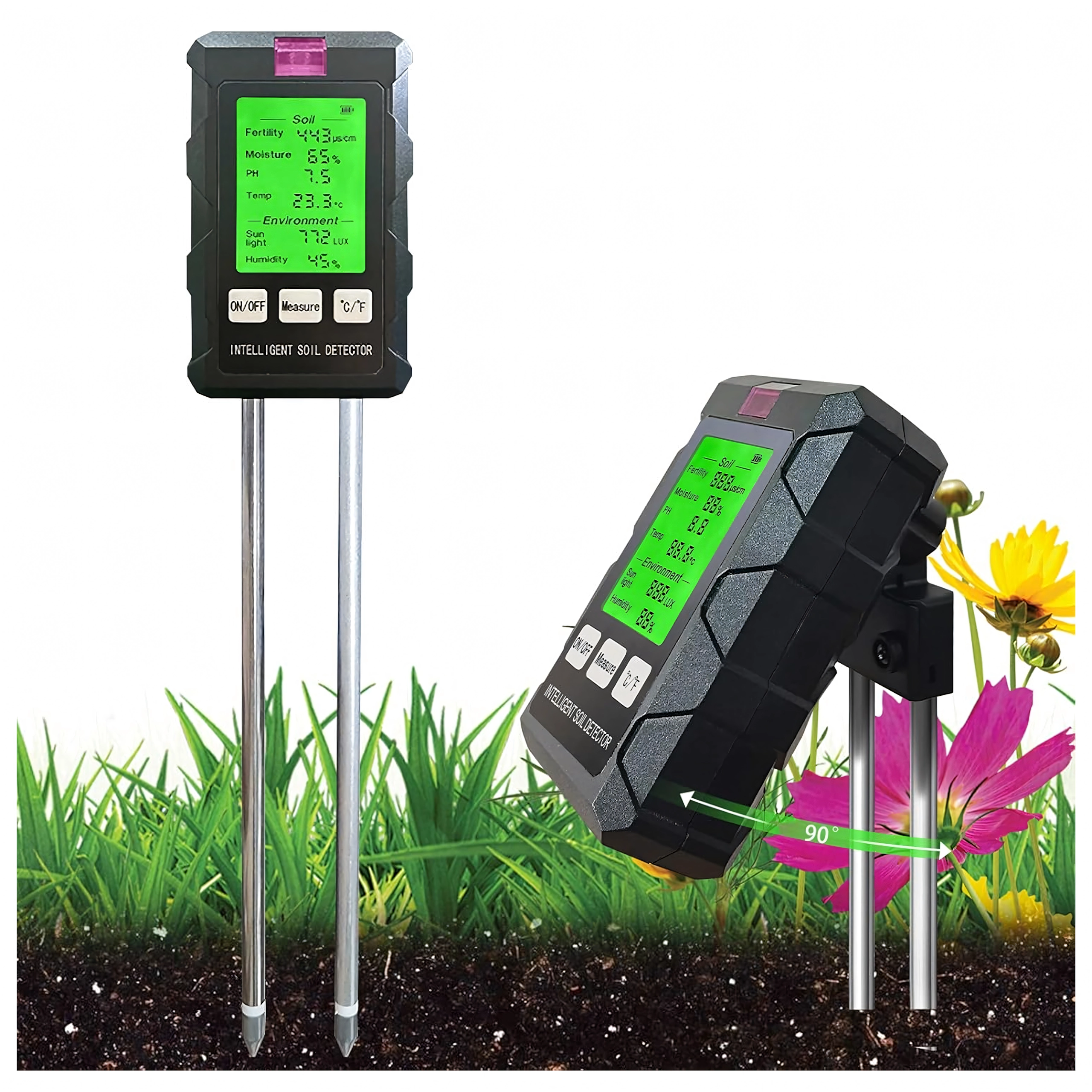 Měří pH, vlhkost a teplotu půdy, úrodnost (živiny), intenzitu světla i vlhkost vzduchu – vše na jednom podsvíceném displeji pro rychlé rozhodování při péči o rostliny.