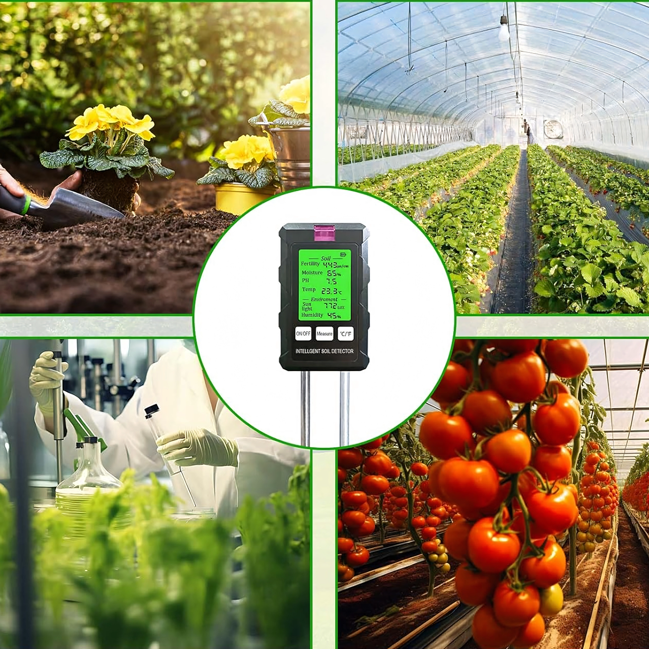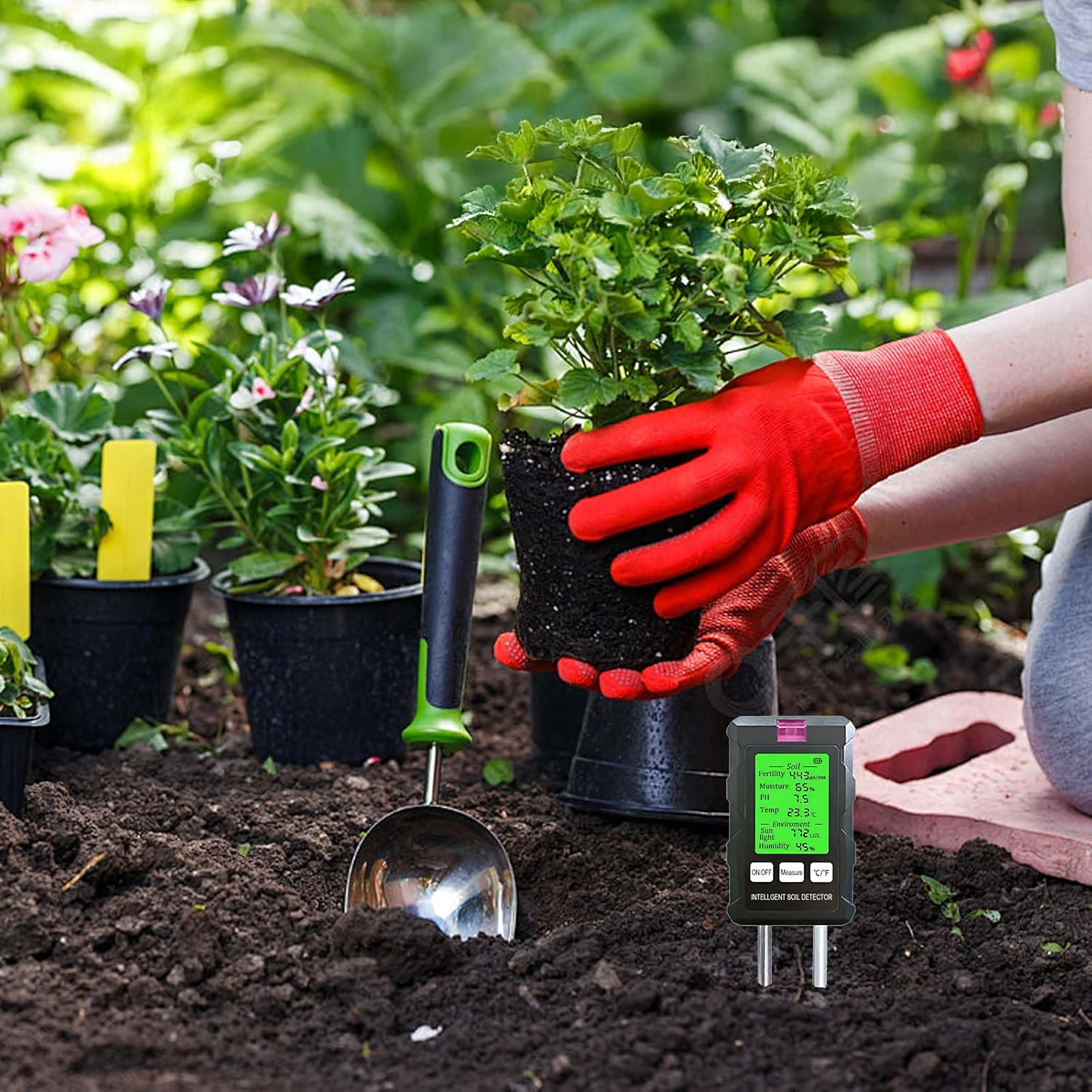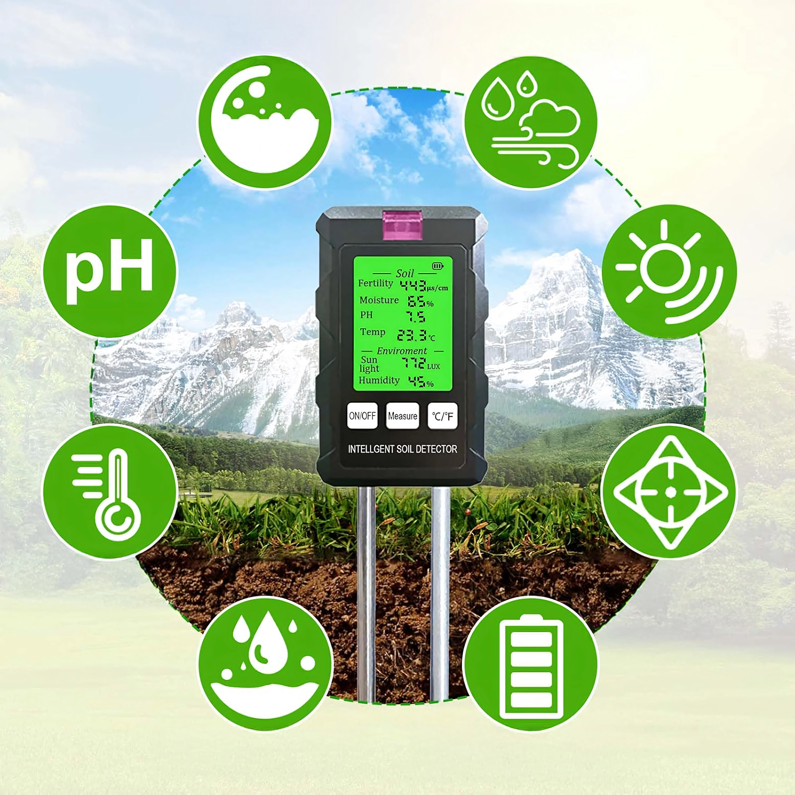 Zařízení kombinuje šest měření v jednom kompaktním přístroji: sleduje pH půdy, vlhkost, teplotu, úrodnost (živiny), intenzitu světla a vlhkost okolního vzduchu. Díky tomu snadno předejdete přelití, nedostatku živin i špatnému stanovišti a docílíte zdravého růstu a bohatého kvetení.