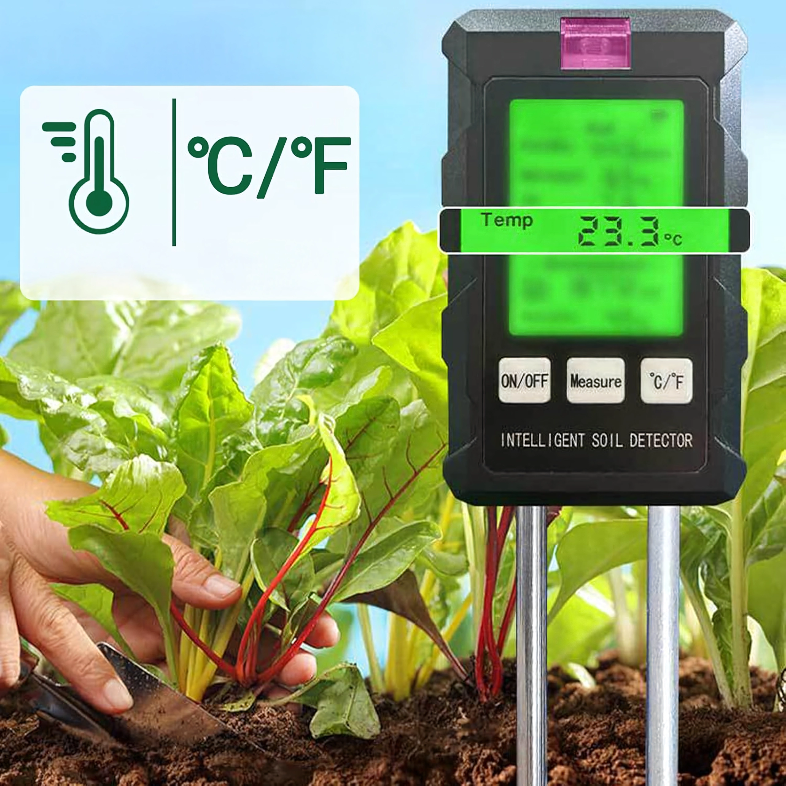 Udržte své rostliny v nejlepší kondici díky univerzálnímu půdnímu testeru 6v1. Stačí zasunout dvojité kovové sondy do substrátu a jedním tlačítkem získáte klíčové informace pro správné zavlažování, hnojení a umístění rostlin. Podsvícený displej je skvěle čitelný venku na slunci i doma.