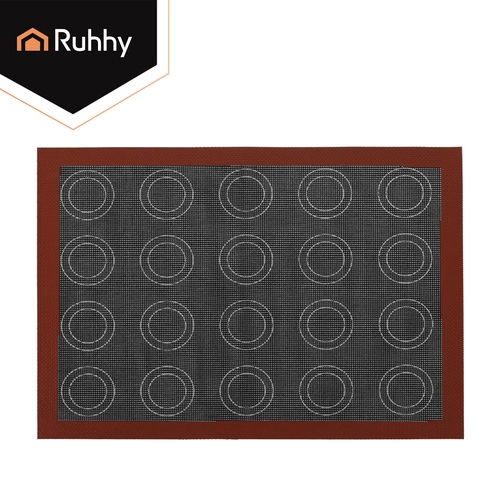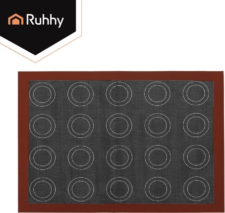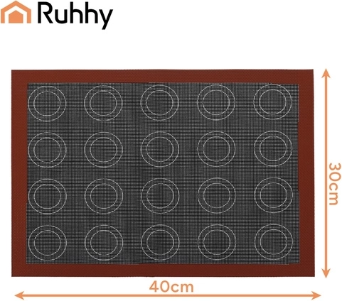 Praktická silikonová podložka RUHHY o rozměru 30 × 40 cm usnadní přípravu perfektně křupavých dezertů bez papíru na pečení a bez tuku. Díky mikroperforaci a výztuži ze skelných vláken zajišťuje rovnoměrnou distribuci tepla, rychlejší odvod vlhkosti a nepřilnavý povrch pro snadné oddělení pečiva. Je oboustranná – jedna strana pro eklerky, druhá pro makronky – a představuje ekologickou, znovupoužitelnou alternativu k jednorázovým podložkám.
