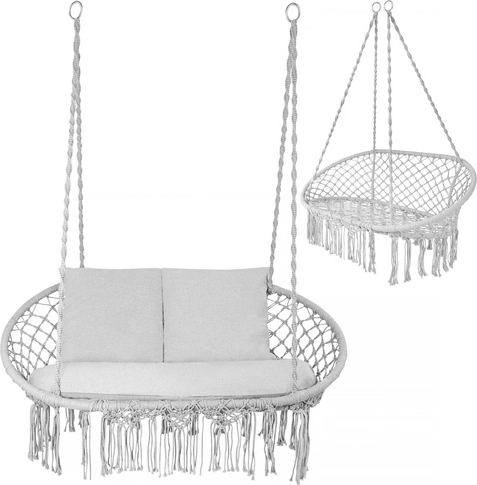 Snadné zavěšení umožňují 4 odolná lana s kovovými kroužky – houpačku připevníte ke stropnímu trámu, ke konstrukci pergoly nebo na samostatný stojan. Vhodná je na zahradu, terasu, balkon i do obývacího pokoje. Potahy polštářů lze prát na 30 °C, takže údržba je jednoduchá a rychlá.