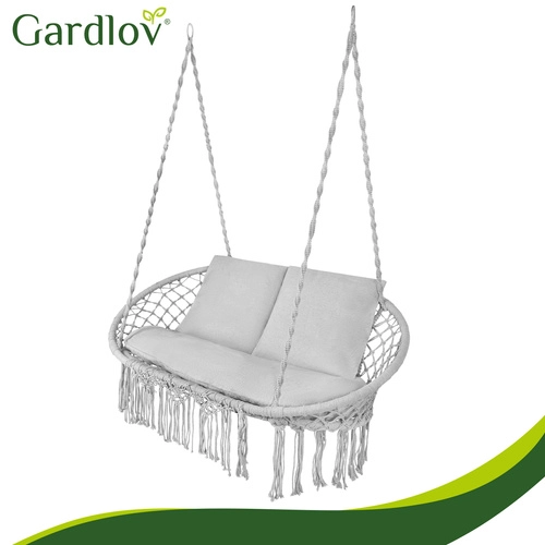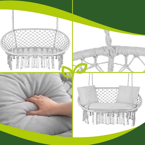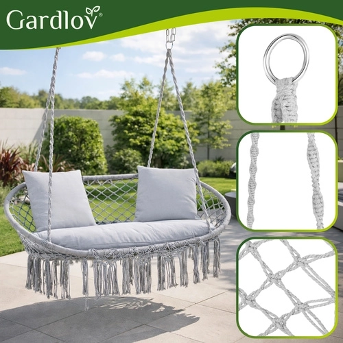 Užijte si klidné chvíle odpočinku na zahradě, terase či balkoně s prostornou závěsnou houpačkou typu bocianí hnízdo GARDLOV pro dvě osoby. Nabízí nosnost až 300 kg, široké a pohodlné sedadlo a v balení najdete 3 měkké polštáře pro maximální komfort. Odolná kovová konstrukce, čtyři pevná lana s kovovými oky a stylový boho design z ní dělají elegantní a bezpečné místo pro relax celé rodiny – doma i venku.