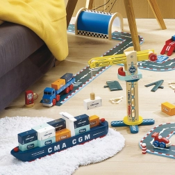 Model vznikl ve spolupráci s přední přepravní společností CMA CGM, takže hra má realistický nádech. Je plně kompatibilní s celou kolekcí Vilacity – přidejte přístavní jeřáb, loď nebo další sady a rozšiřte příběhy o nakládce, přepravě a logistice.