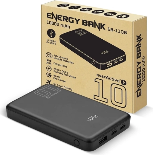Kompaktní powerbanka s kapacitou 10 000 mAh nabízí rychlé nabíjení 20W přes USB‑C, tři výstupy (2× USB‑C, 1× USB‑A), podporu PD3.0/QC4+ a přehledný LCD displej stavu baterie. Díky funkci pass‑through a režimu Always‑On bezpečně dobije i zařízení s nízkým odběrem, jako jsou smartwatch či bezdrátová sluchátka.