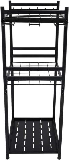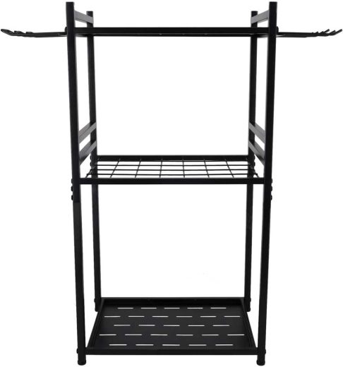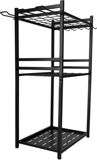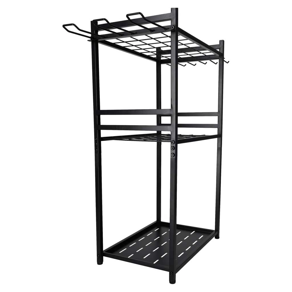 Hodí se do zahrady, na terasu, do garáže, sklepa i zahradního domku. Víceúrovňové řešení s bočními háčky šetří prostor a urychluje práci. Stojan je navržen pro dlouhou životnost a každodenní zátěž.