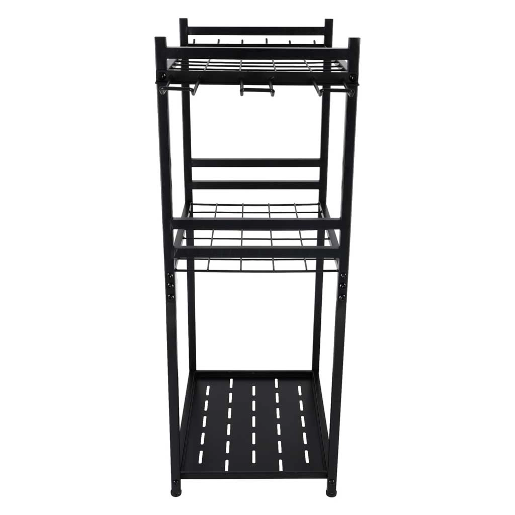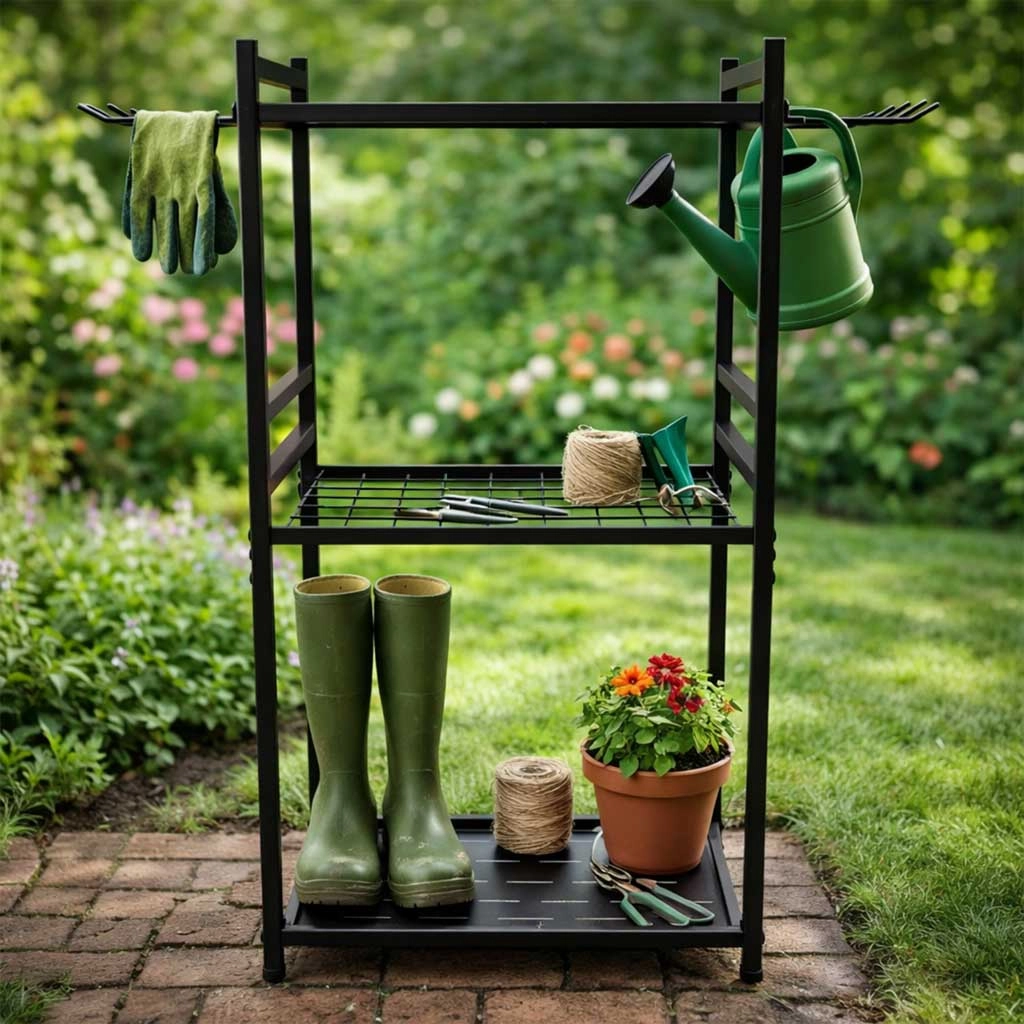 Rám z uhlíkové oceli a odvětrávané police udrží i těžší nářadí bez viklání. Otevřený design napomáhá odtoku vody a cirkulaci vzduchu.