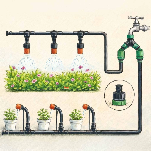 Y rozdělovač s uzávěry a rychlospojkami umožní napojit dvě větve z jednoho zdroje a samostatně řídit průtok pro různé zóny zavlažování.