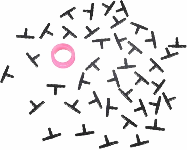 Dvě 12,5m cívky flexibilní hadice, desítky T-konektorů a kolíků pro snadné vedení a větvení – přizpůsobíte rozmístění přesně vašemu záhonu.