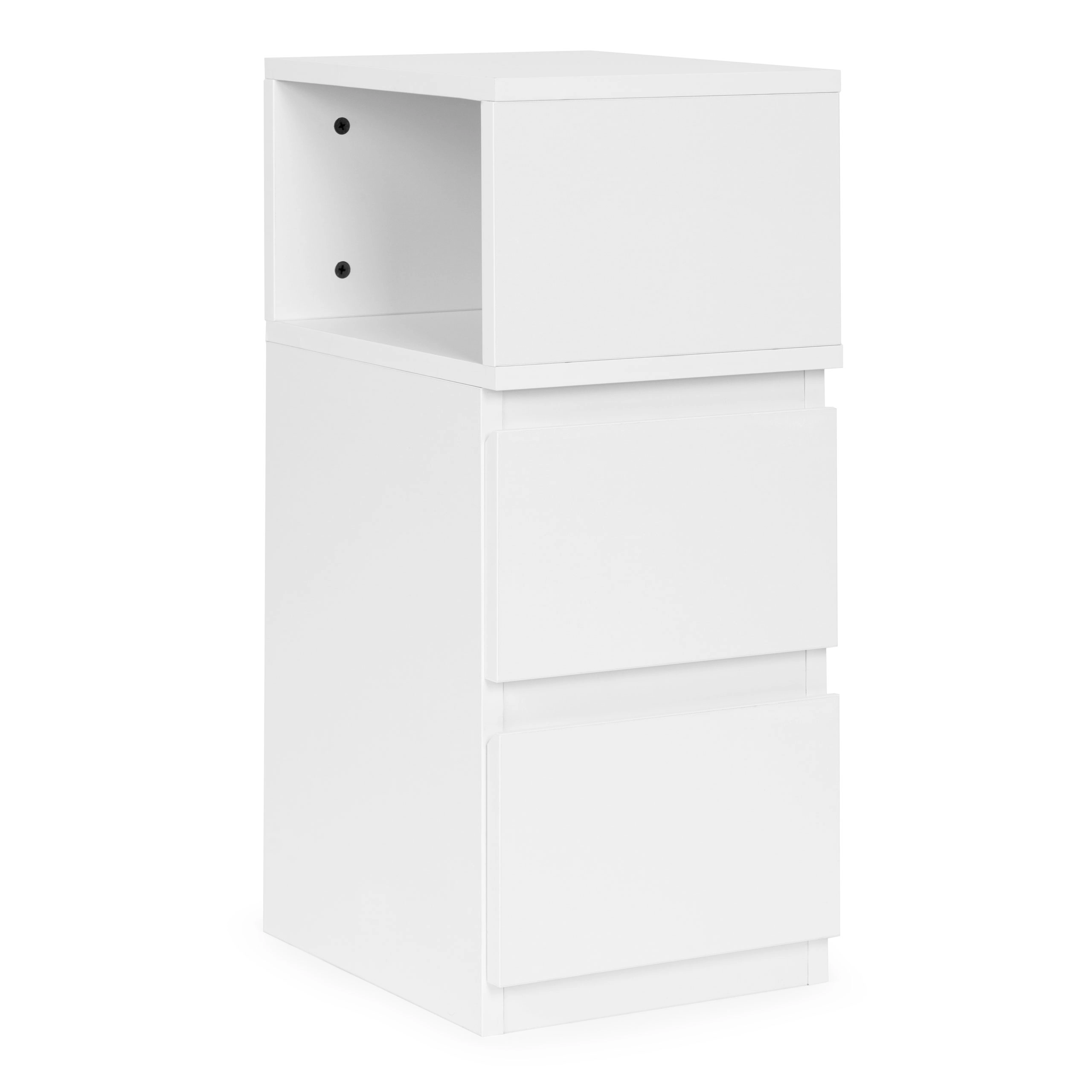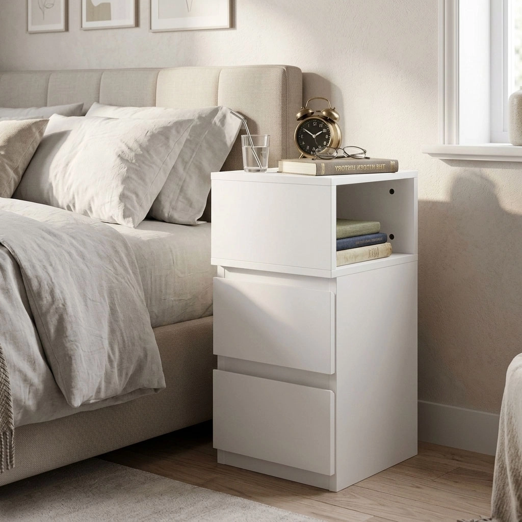 Uložte si vše potřebné: dvě prostorné zásuvky pro pořádek bez kompromisů a horní otevřená přihrádka pro knihy, brýle či telefon na dosah.