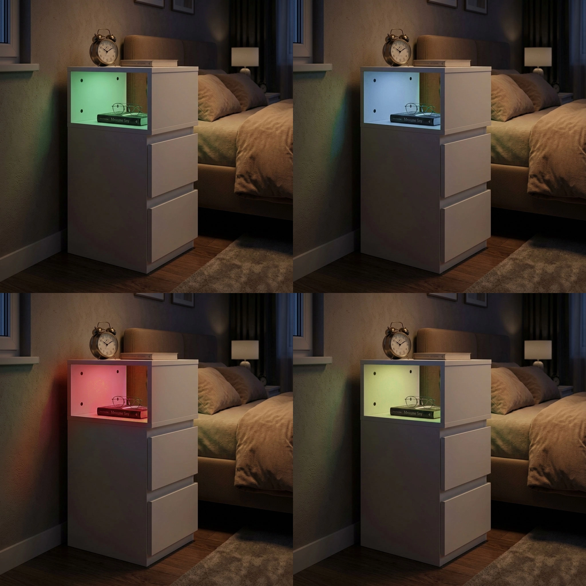Vylaďte atmosféru ložnice stylovým nočním stolkem ModernHome. Integrované RGB LED podsvícení v otevřené přihrádce navodí klid pro čtení i večerní relax. Ovládání je snadné – pomocí dálkového ovladače zvolíte z 16 barev a efektů (Flash, Strobe, Fade, Smooth), zatímco mobilní aplikace nabídne ještě širší paletu a plynulé nastavení jasu.