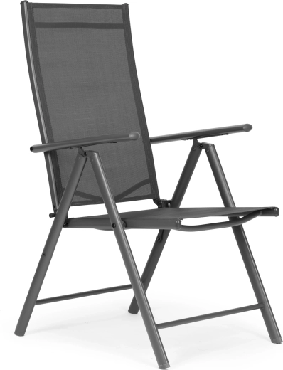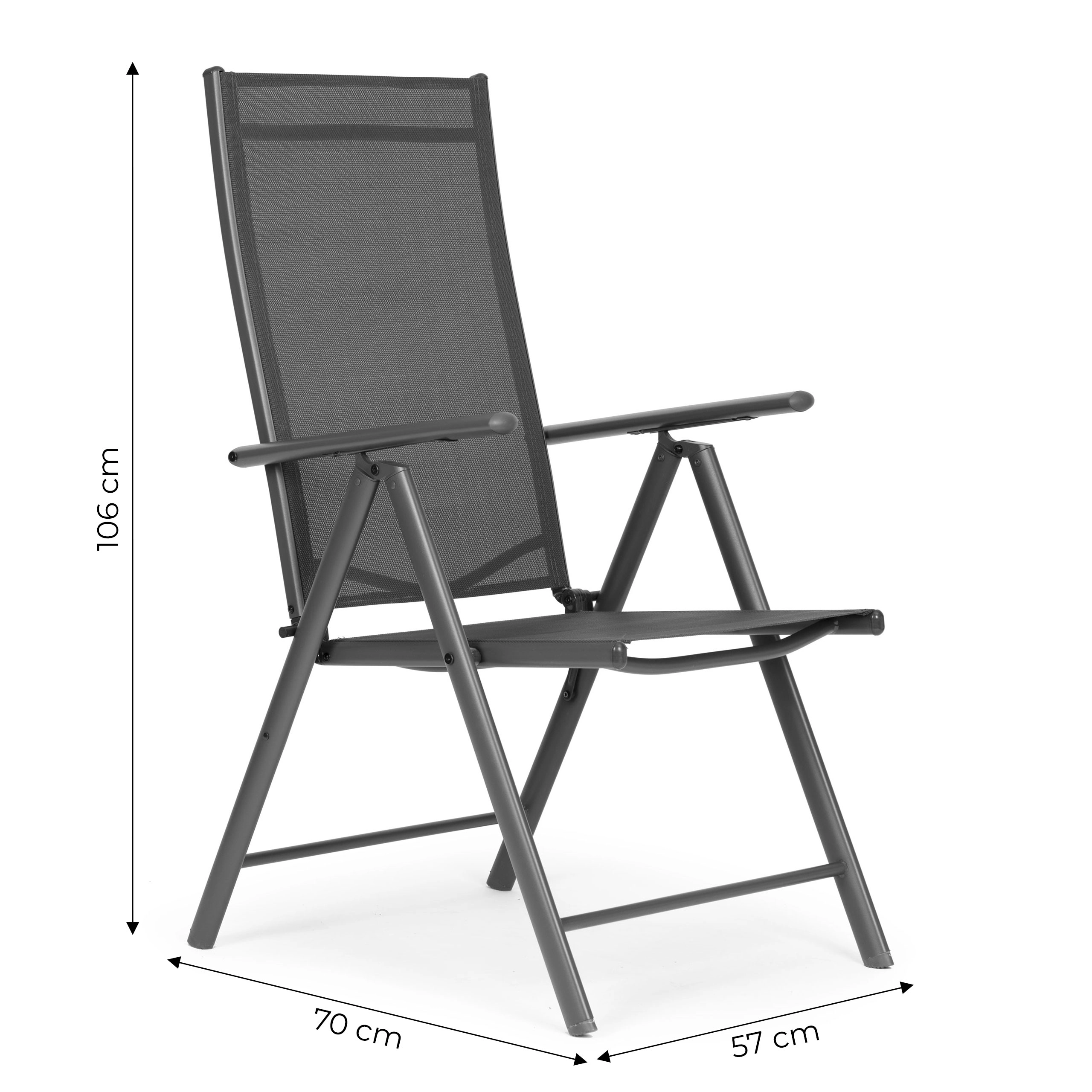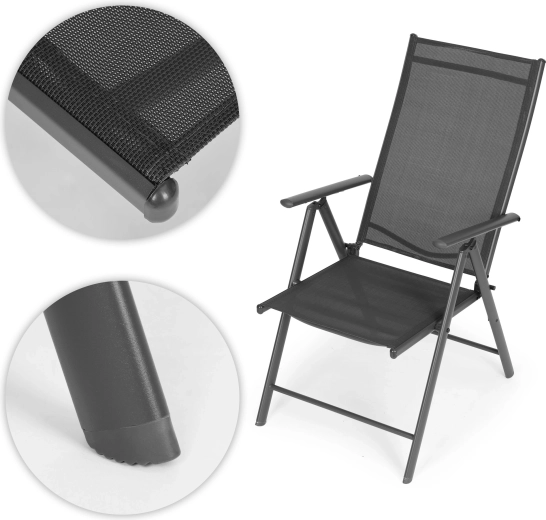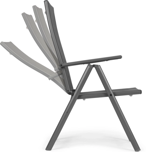 Stylová a odolná zahradní židle MULTIGARDEN nabízí pohodlí pro relax na zahradě, terase i balkoně. Má 7stupňové nastavení opěradla, stabilní ocelovou konstrukci s práškovým lakem, prodyšnou textilní síťovinu odolnou vůči počasí, pohodlné područky a skládací konstrukci pro snadné přenášení a skladování. Maximální nosnost 100 kg.