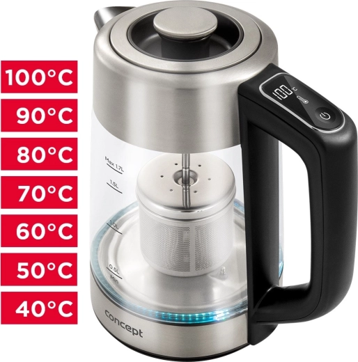 Digitální ovládání nabízí přesné nastavení teploty v rozmezí 40–100 °C (až do varu). Barevné LED podsvícení informuje o aktuální teplotě vody na první pohled. Funkce Keep Warm udrží vodu na zvolené teplotě – ideální pro opakované zalévání čaje, kávy či přípravu dětské výživy.