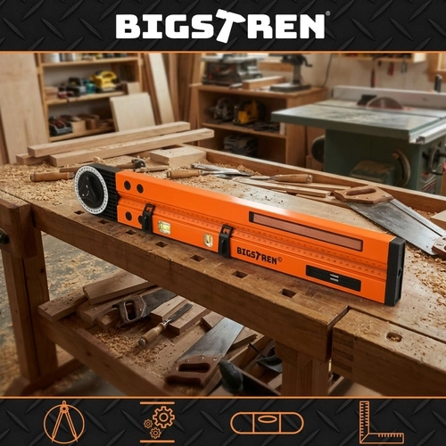 Integrované pravítko 500 mm se čitelnou metrickou stupnicí šetří čas – nemusíte sahat po další míře. Blokace úhlu udrží nastavení stabilní při přenášení na materiál a pevné tělo z hliníkové slitiny s prvky ABS odolá náročnému provozu. Kompaktní konstrukce nahrazuje více nástrojů, takže ušetříte místo v kufru i na pracovišti.