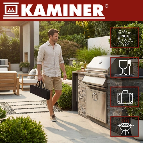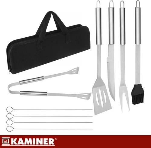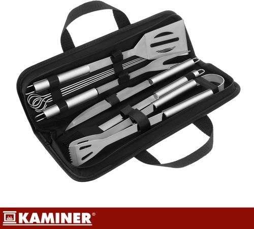 Praktická sada grilovacího náčiní KAMINER vám udrží pořádek při každém grilování – všechny nástroje máte přehledně v jednom pevném pouzdře. Obsahuje 9 dílů z odolné nerezové oceli s dlohými rukojeťmi pro bezpečnější práci u žáru, háčky na zavěšení a saténové úchopy pro jistý a komfortní stisk. Snadné čištění, certifikace LFGB pro kontakt s potravinami a rychlé přenášení dělají ze sady ideálního společníka na zahradu, chatu i cesty.