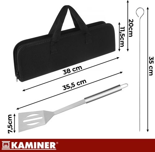 - Jehlové špízy: 35 × 2,5 cm; obracečka: 35,5 × 7,5 cm; kleště: 34,5 × 4,5 cm; štětec: 33 × 4,2 cm; vidlice: 35,5 × 3,5 cm; nůž: 33 × 2,5 cm
