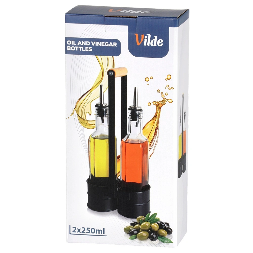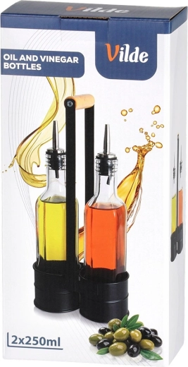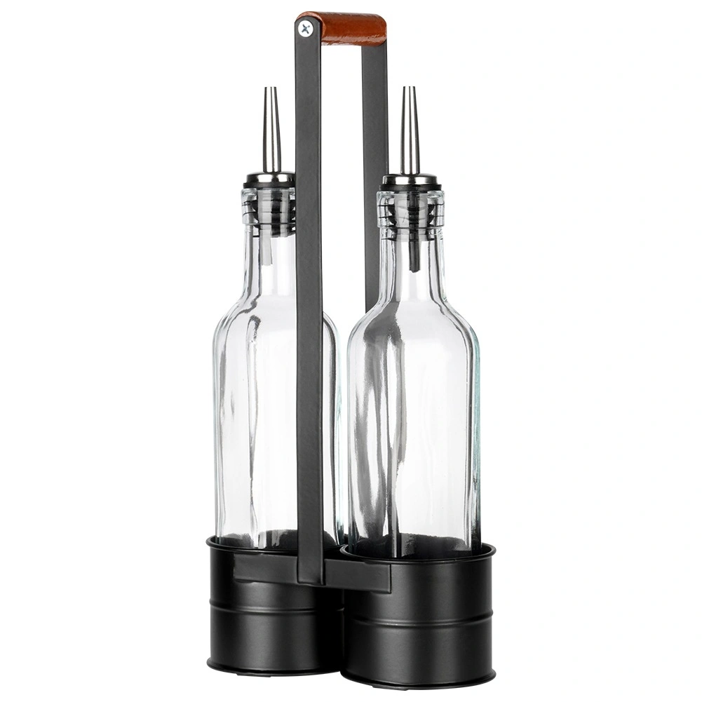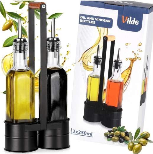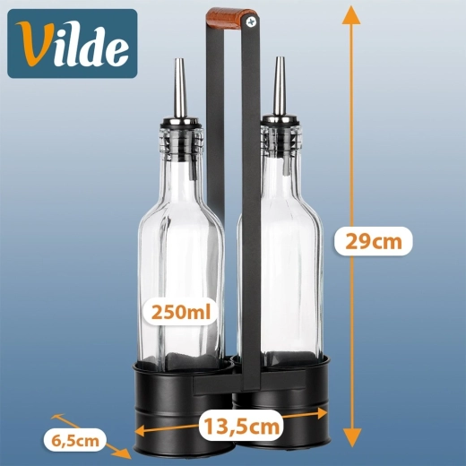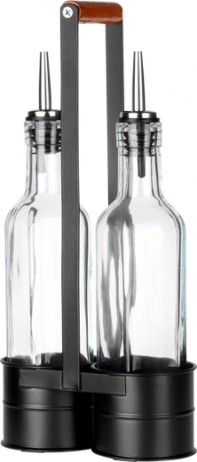 Tato praktická sada obsahuje dvě čiré skleněné lahve 250 ml umístěné v pevném kovovém stojanu s vysokým držadlem pro snadné přenášení. Nerezové nalévací hrdlo zpomaluje průtok pro kontrolované, bezkapkové nalévání oleje či octa. Kombinace kvalitního skla a černého kovu dodá vaší kuchyni moderní, dekorativní vzhled.