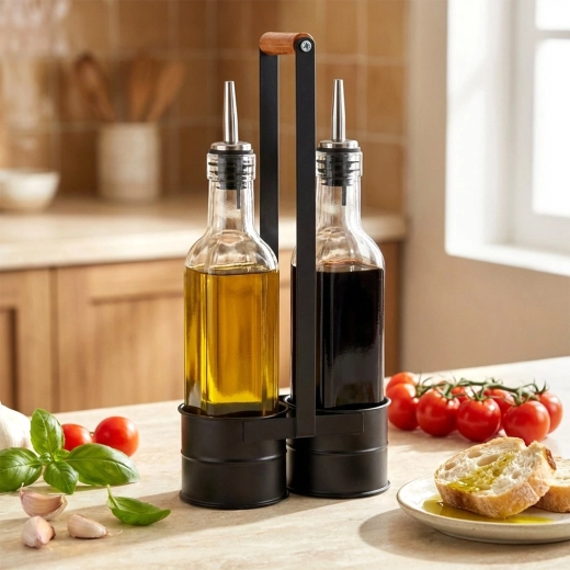 Skvěle slouží k uchování a servírování olivového oleje, vinného či balzamikového octa – doma, v bistrech i restauracích. Efektní prezentace ochucených olejů podtrhne styl stolování, zatímco stojan udrží láhve stabilně a přehledně na jednom místě.