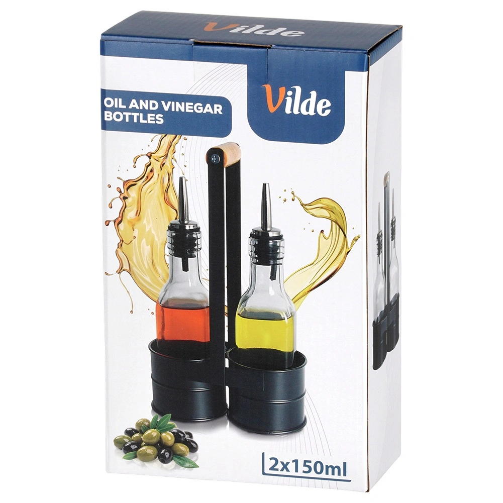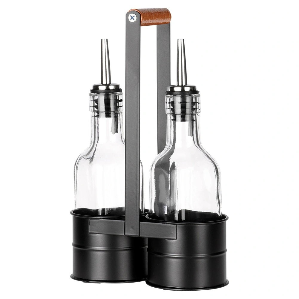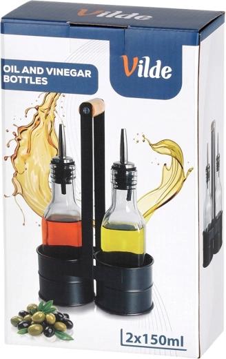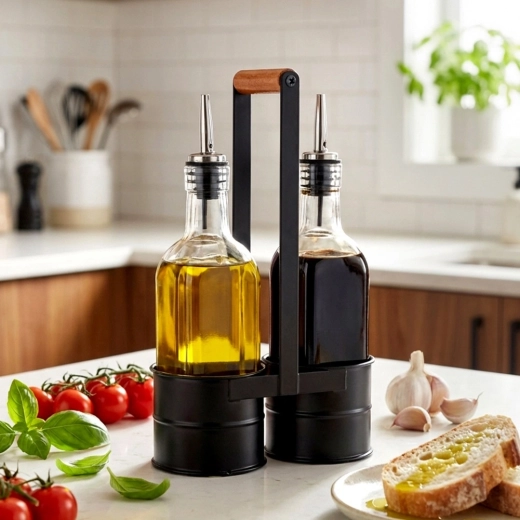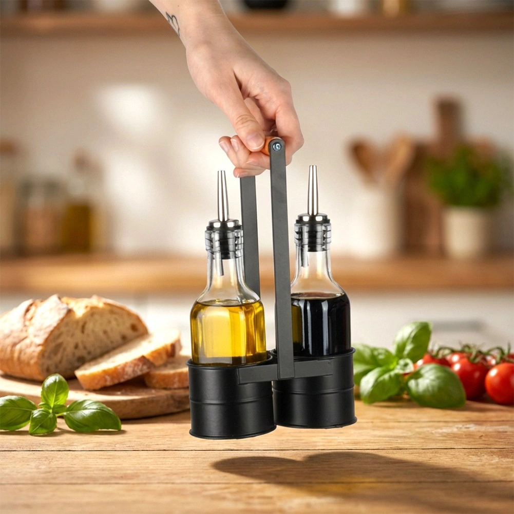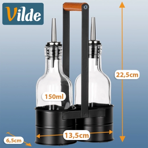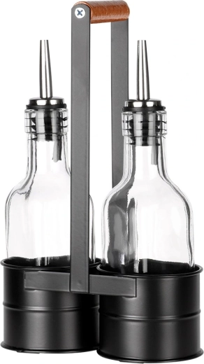 Tato designová sada 2 lahví z čirého skla je ideální pro skladování a servírování olivového oleje i octa. Kovový stojan v černé barvě s pohodlným dřevěným úchytem udrží lahve bezpečně pohromadě a usnadní přenášení po kuchyni i jídelním stole. Nerezové nálevky zpomalují průtok a minimalizují kapání, takže dochází k kontrolovanému a bezproblémovému nalévání.
