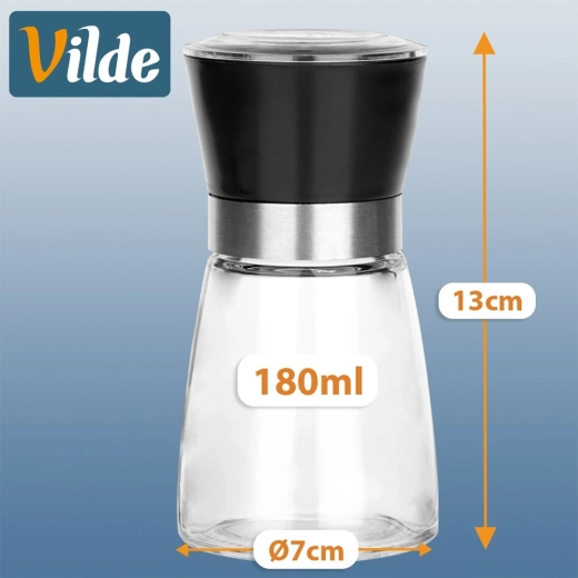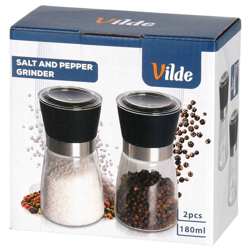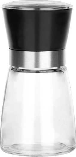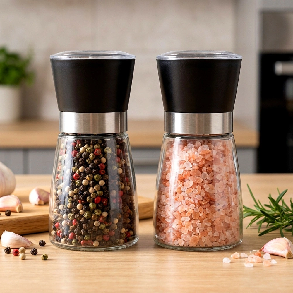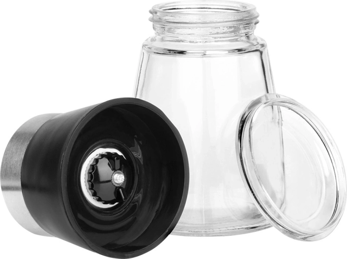 Sada dvou ručních mlýnků kombinuje moderní design se spolehlivým výkonem. Skleněné tělo s černým víčkem a nerezovým kroužkem působí elegantně na kuchyňské lince i jídelním stole. Ceramický mlecí mechanismus si poradí i s tvrdšími zrny a zajišťuje rovnoměrné mletí.