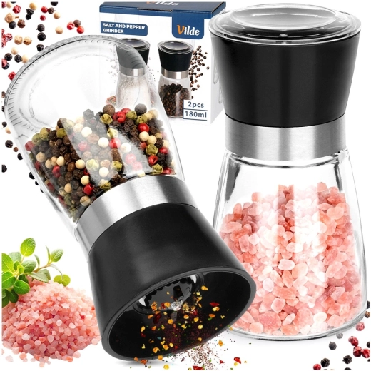 Elegantní sada dvou ručních mlýnků na sůl, pepř a další koření se skleněným tělem a keramickým mlecím mechanismem pro dlouhou životnost. Díky průhlednému provedení vždy vidíte obsah a množství. Regulace hrubosti mletí, ochranné víčko proti sypání a snadné plnění i čištění dělají z této sady praktického pomocníka pro každou kuchyni i gastronomii.