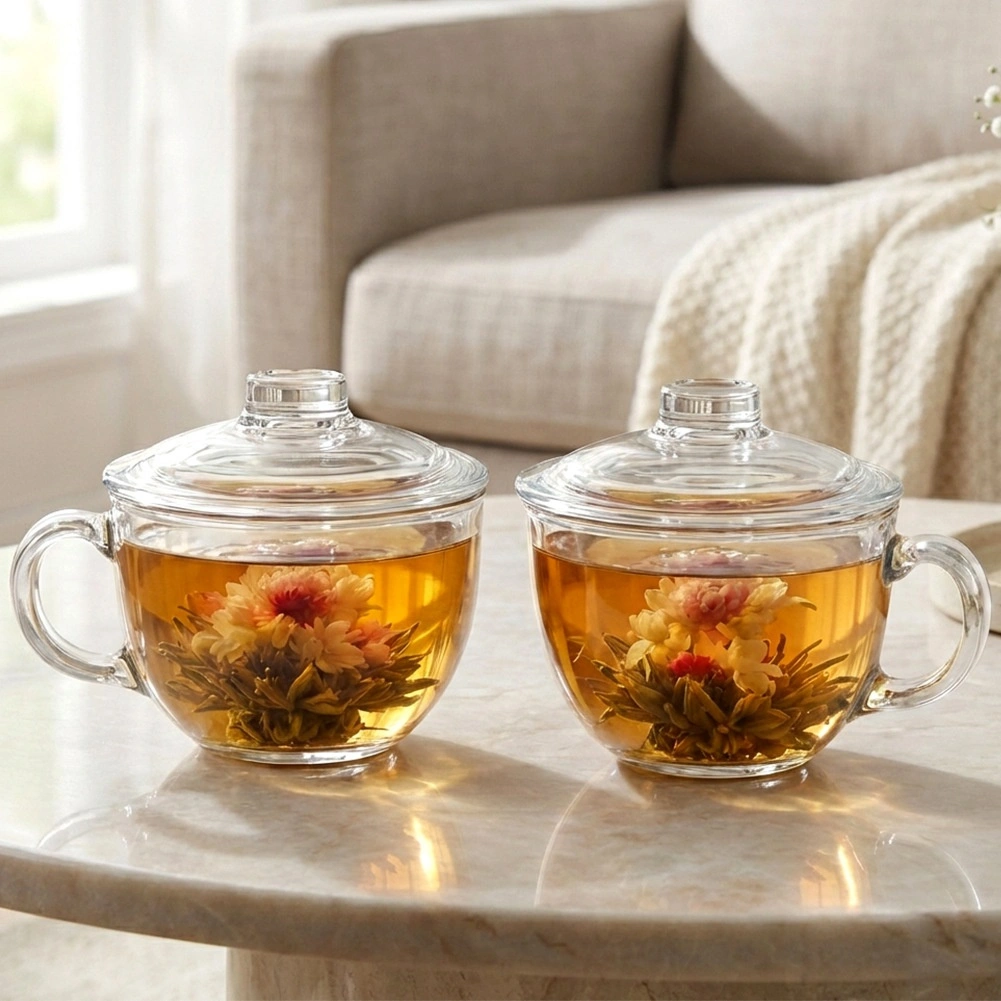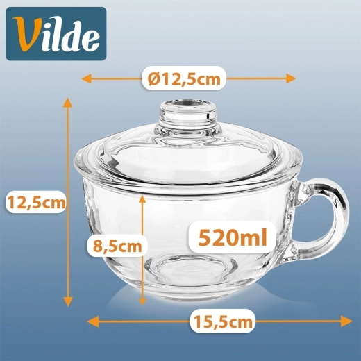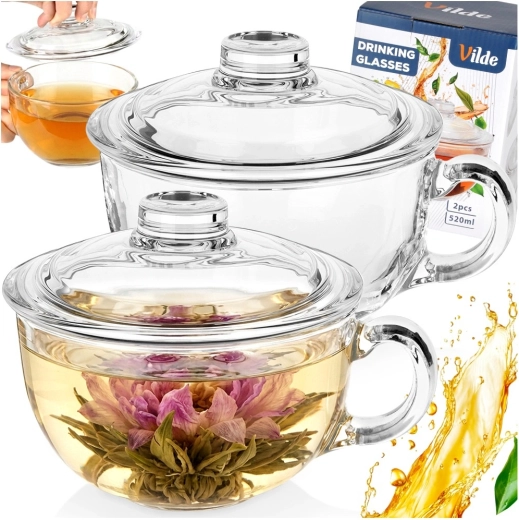 Elegantní skleněné hrnky s víčkem o objemu 520 ml jsou ideální pro servírování čaje, bylinkových nálevů, kávy i studených nápojů. Odolné teplu, s praktickým víčkem pro udržení teploty a pohodlným uchem pro bezpečné uchopení. Vhodné do myčky nádobí.