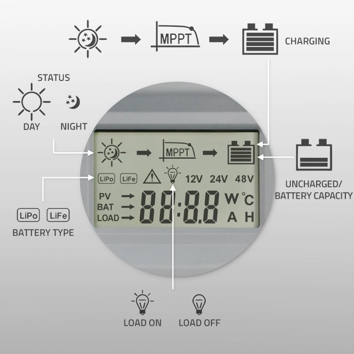 Využijte energii slunce naplno díky inteligentnímu řízení s MPPT. Regulátor průběžně sleduje pracovní bod panelů a maximalizuje výkon i při proměnlivých podmínkách, jako je částečné zastínění nebo kolísající intenzita světla. Přehledný LCD displej a Bluetooth napojení s mobilní aplikací vám umožní rychlou konfiguraci, vzdálený dohled a jasný přehled o aktuálních hodnotách systému.