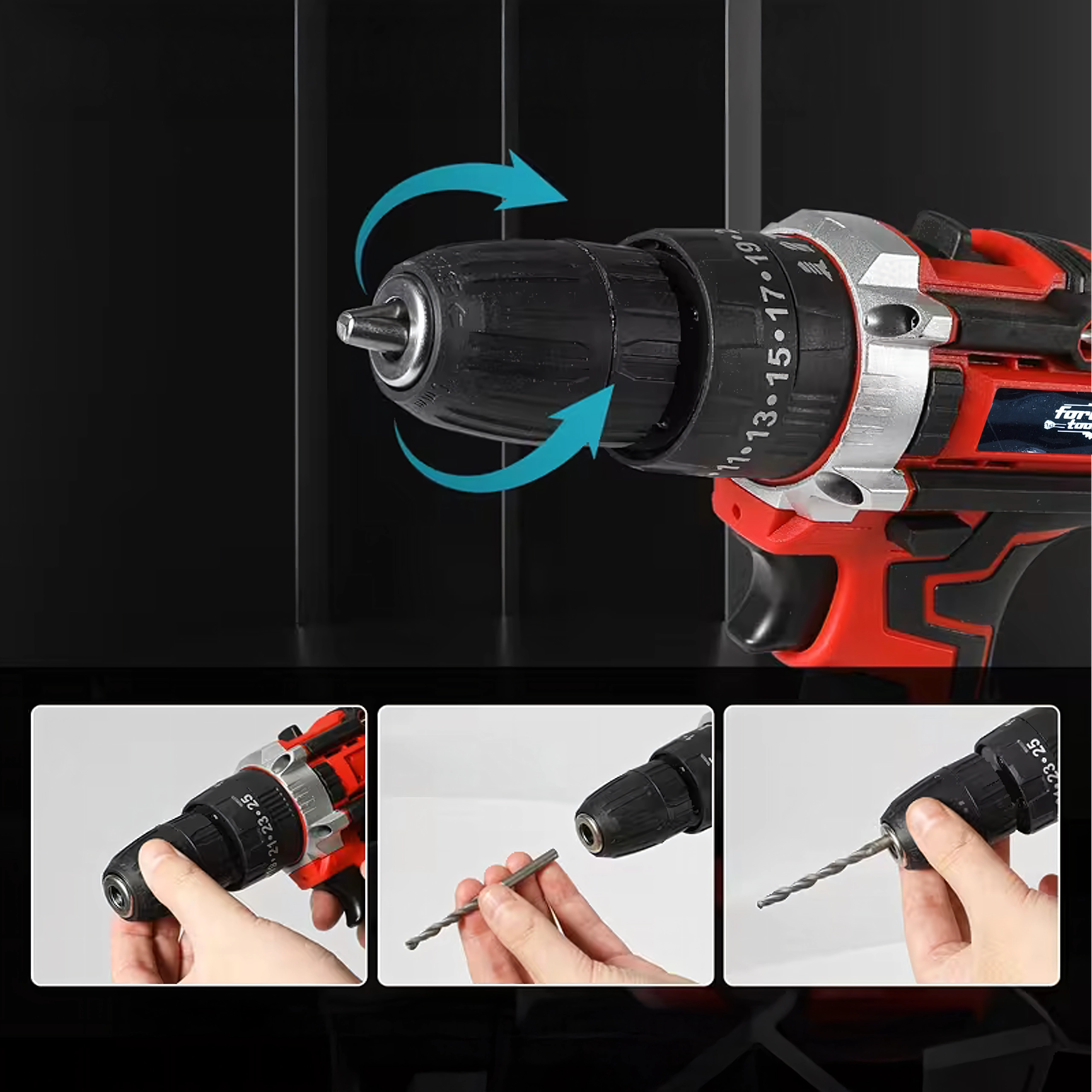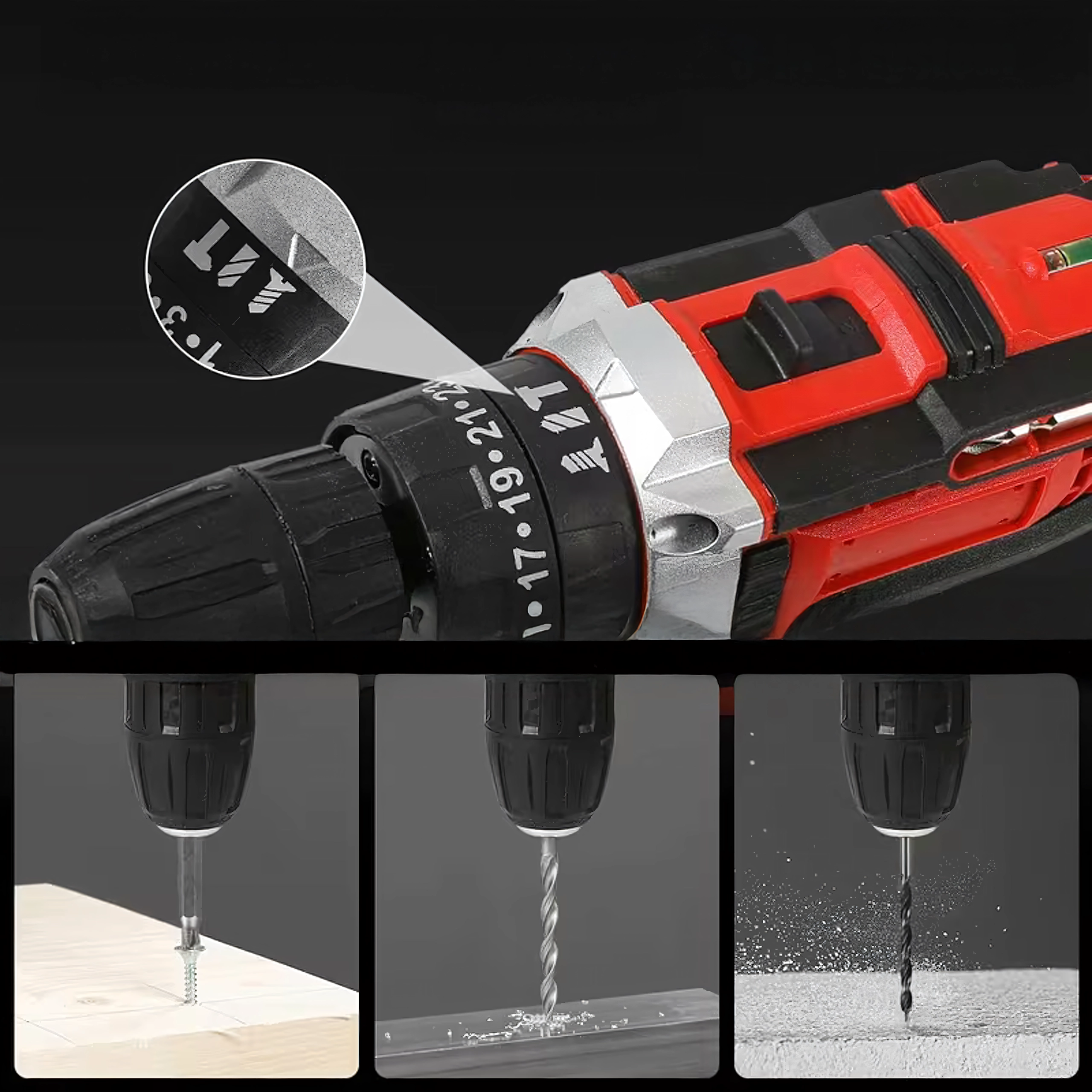 - Univerzální použití: vrtání do dřeva a kovu, šroubování s přesným nastavením momentu