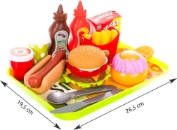 Zábavná sada pro malé kuchaře s až 26 barevnými díly pro hraní na fast food. Obsahuje tác, hamburger, hot dog, fritky, gofr, nápoje a omáčky. Podporuje fantazii, jemnou motoriku a společnou hru s rodiči.