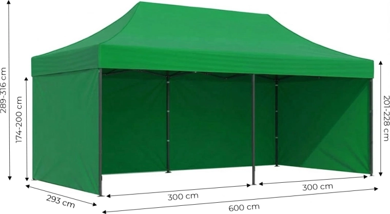 Prostorný zahradní stan 3×6 m s automaticky rozkládacím ocelovým rámem, 4 výškovými stupni a odolnou PE/PVC plachtou. Součástí jsou 4 stěny na suchý zip, kotvící kolíky a lana a praktická přepravní taška. Ideální pro zahradu, akce, trhy a firemní prezentace.