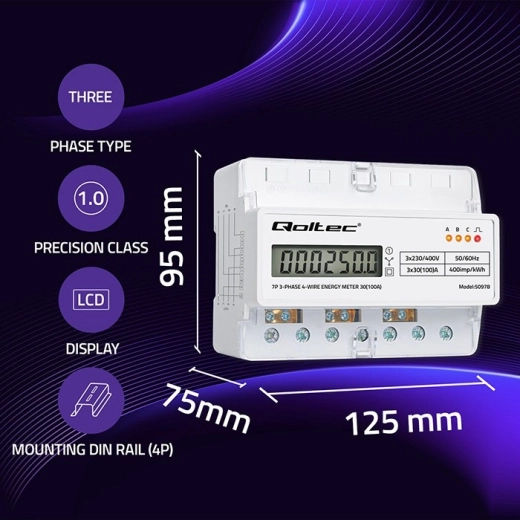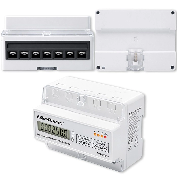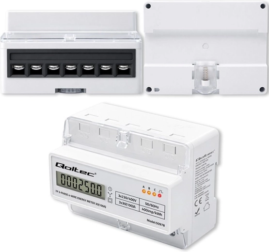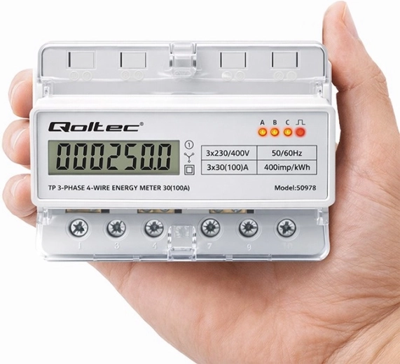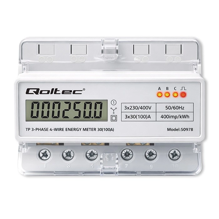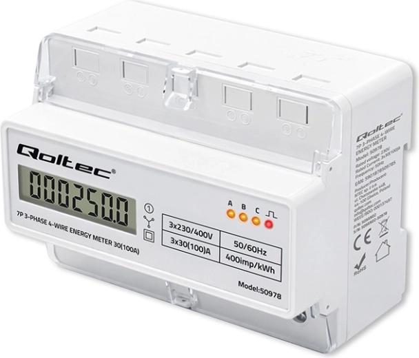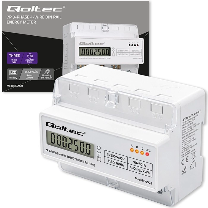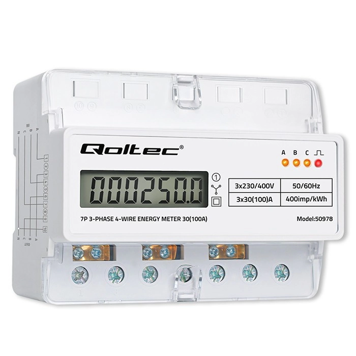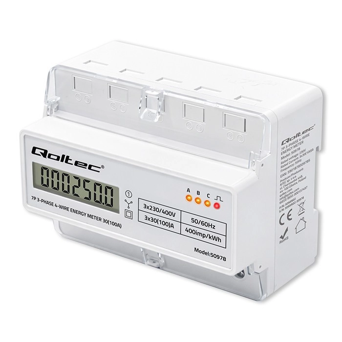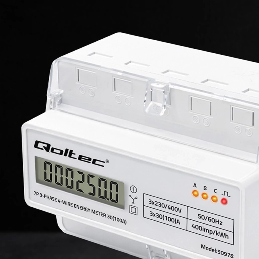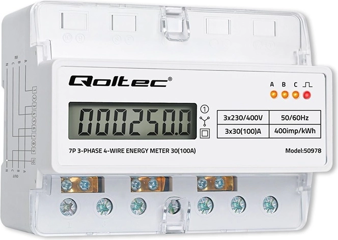 Elektroměr Qoltec poskytuje spolehlivé měření spotřeby elektrické energie pro třífázové, čtyřvodičové instalace s frekvencí 50/60 Hz. Díky LCD displeji 6+1 snadno odečtete hodnoty v kWh, zatímco LED dioda signalizuje odběr s konstantou 400 imp/kWh. Kompaktní provedení a montáž na DIN lištu TH35 zjednodušují instalaci i servis.