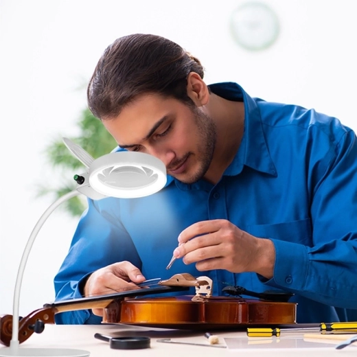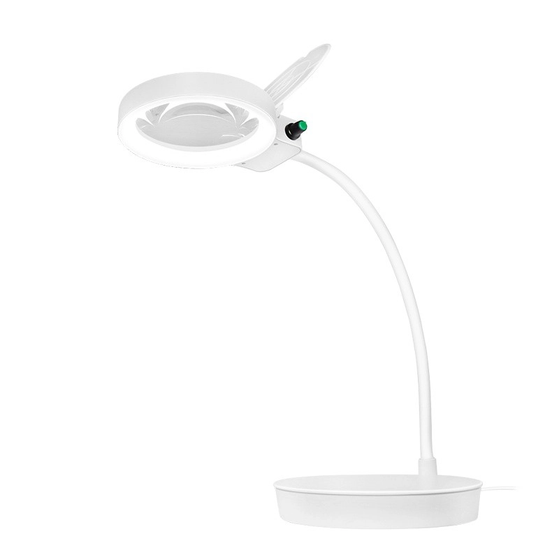 Snadno nastavíte ideální úhel a výšku. Zatížená kulatá základna drží lupu pevně na místě pro pohodlnou hands‑free práci.