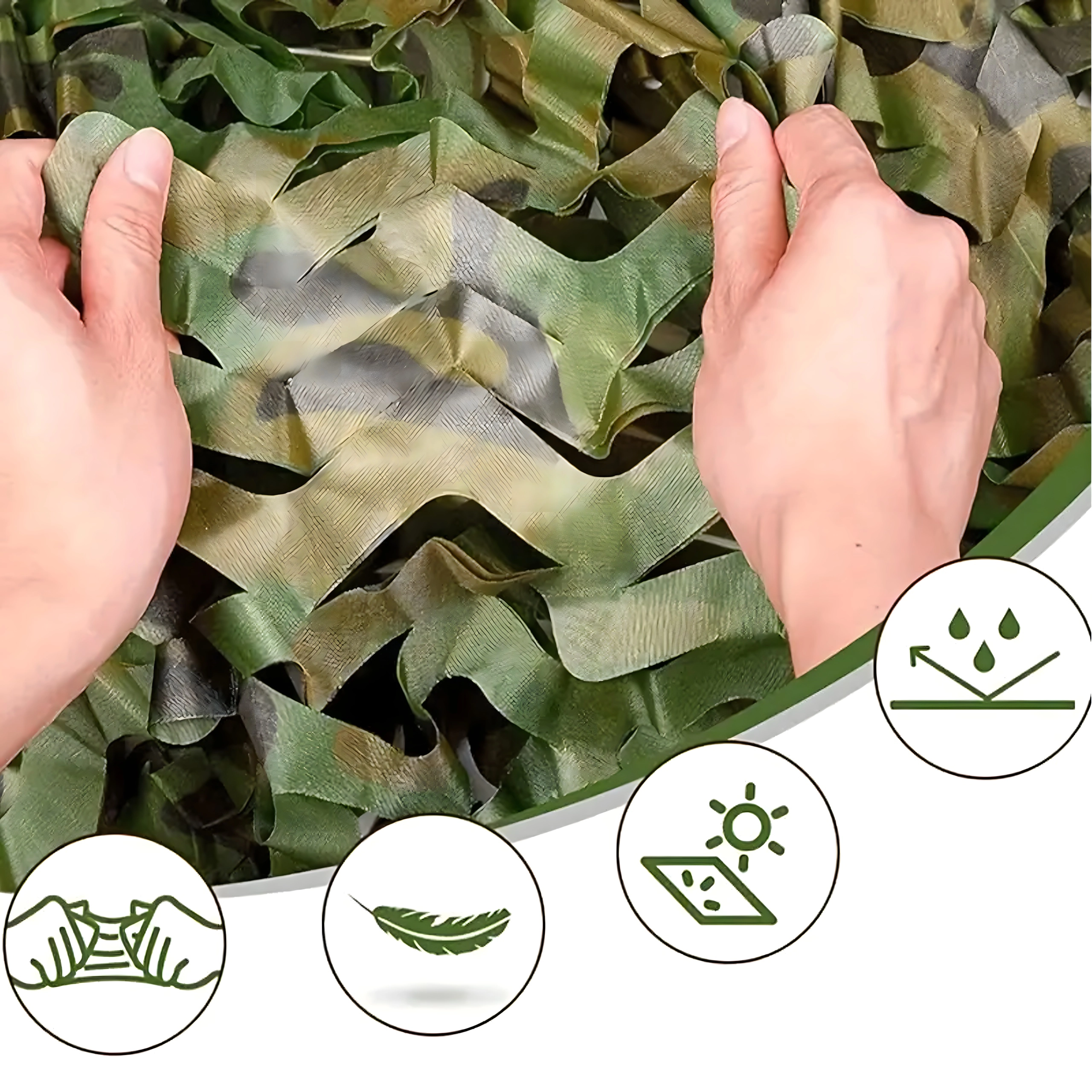 Tato maskovací síť z tkaniny Oxford kombinuje nízkou hmotnost a vysokou odolnost pro každodenní venkovní použití. Vzor moro s listovými výřezy propouští vzduch, vytváří příjemný stín a zajišťuje vizuální skrytí konstrukcí, plotů, techniky nebo posezení.