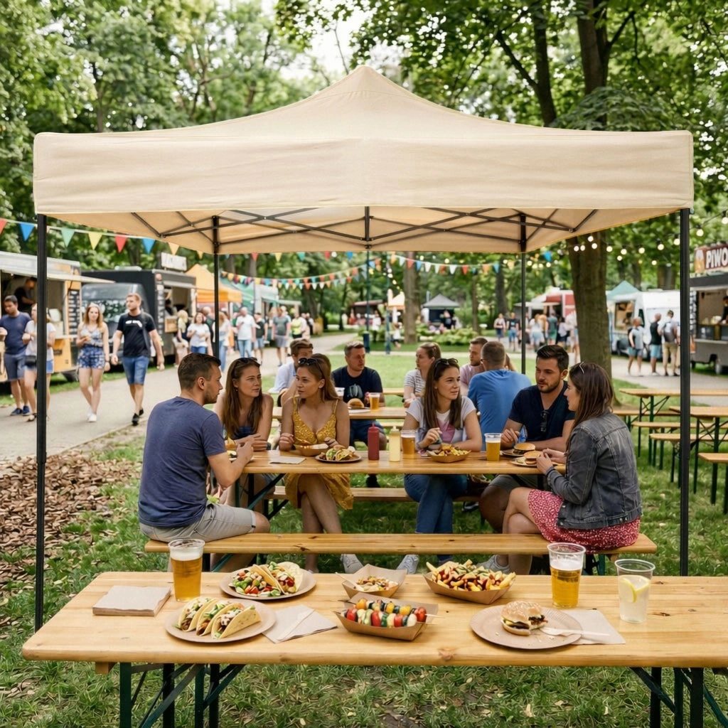 • Vodoodpudivá a UV odolná střecha 420D – spolehlivá ochrana pro hosty i vybavení.