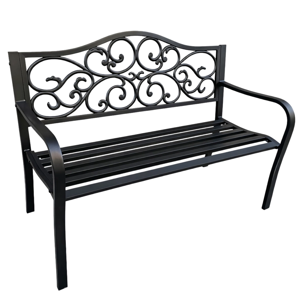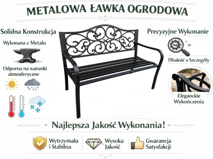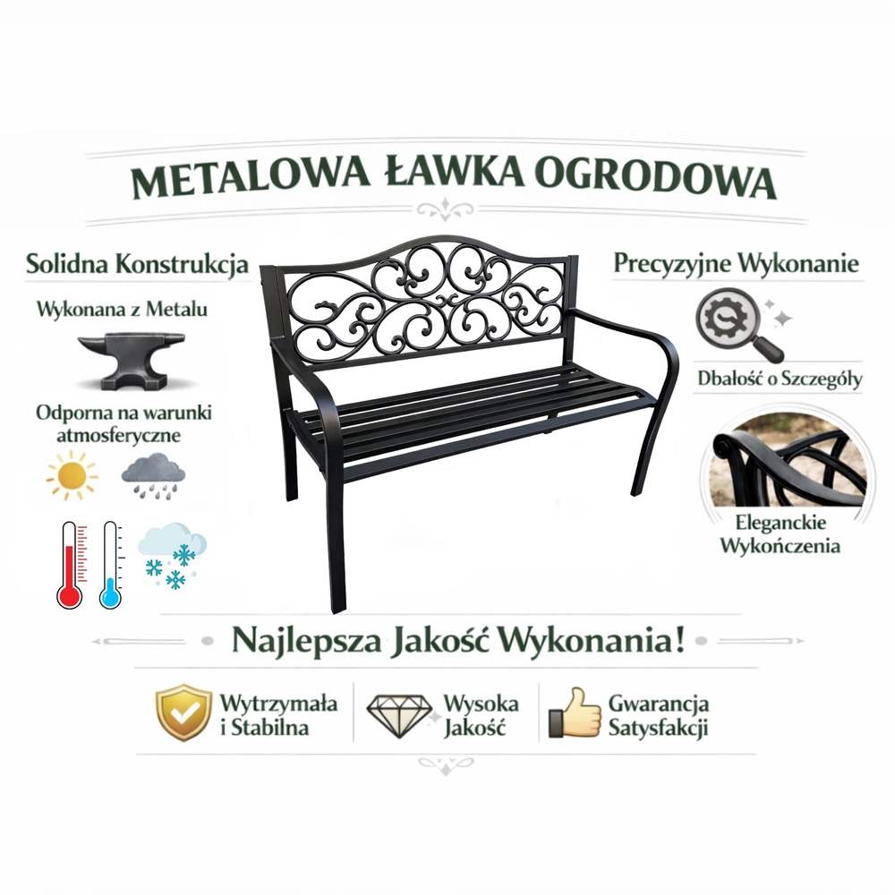 Tato černá kovová lavice je ideální volbou pro zahrady, terasy i veřejné prostory. Bytelný ocelový rám s epoxidovým povrchem odolává korozi a proměnlivému počasí, takže si lavice dlouhodobě udrží svůj reprezentativní vzhled. Dekorativní kovové zdobení opěradla dodává romantický nádech a snadno ladí s moderními i klasickými exteriéry.