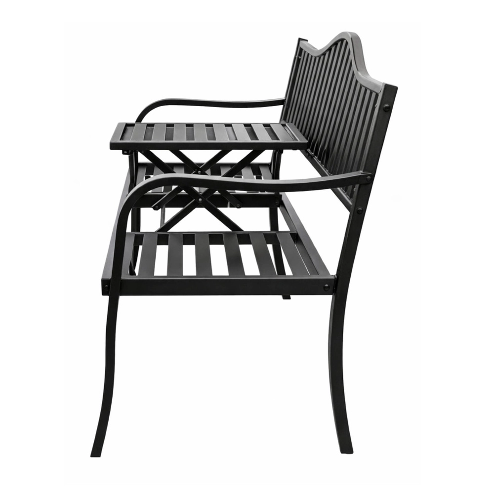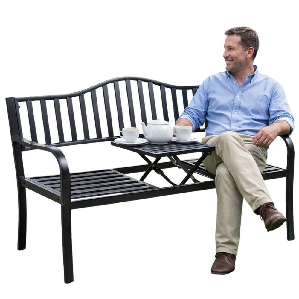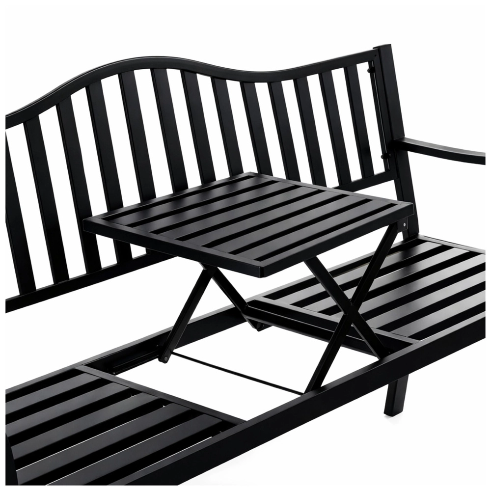 Elegantní kovová zahradní lavička v černé barvě nabízí pohodlné sezení pro tři osoby a praktický sklopný stoleček uprostřed. Díky odolné kovové konstrukci je vhodná na zahradu, terasu i balkon, zatímco lišty sedáku a opěrky zajišťují odvod vody a lepší cirkulaci vzduchu. Ideální pro relax na čerstvém vzduchu i posezení s přáteli.