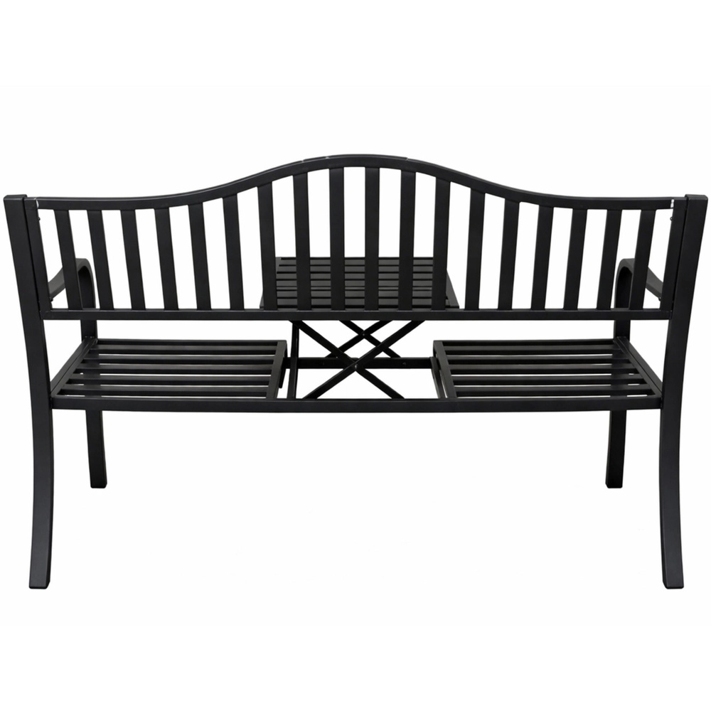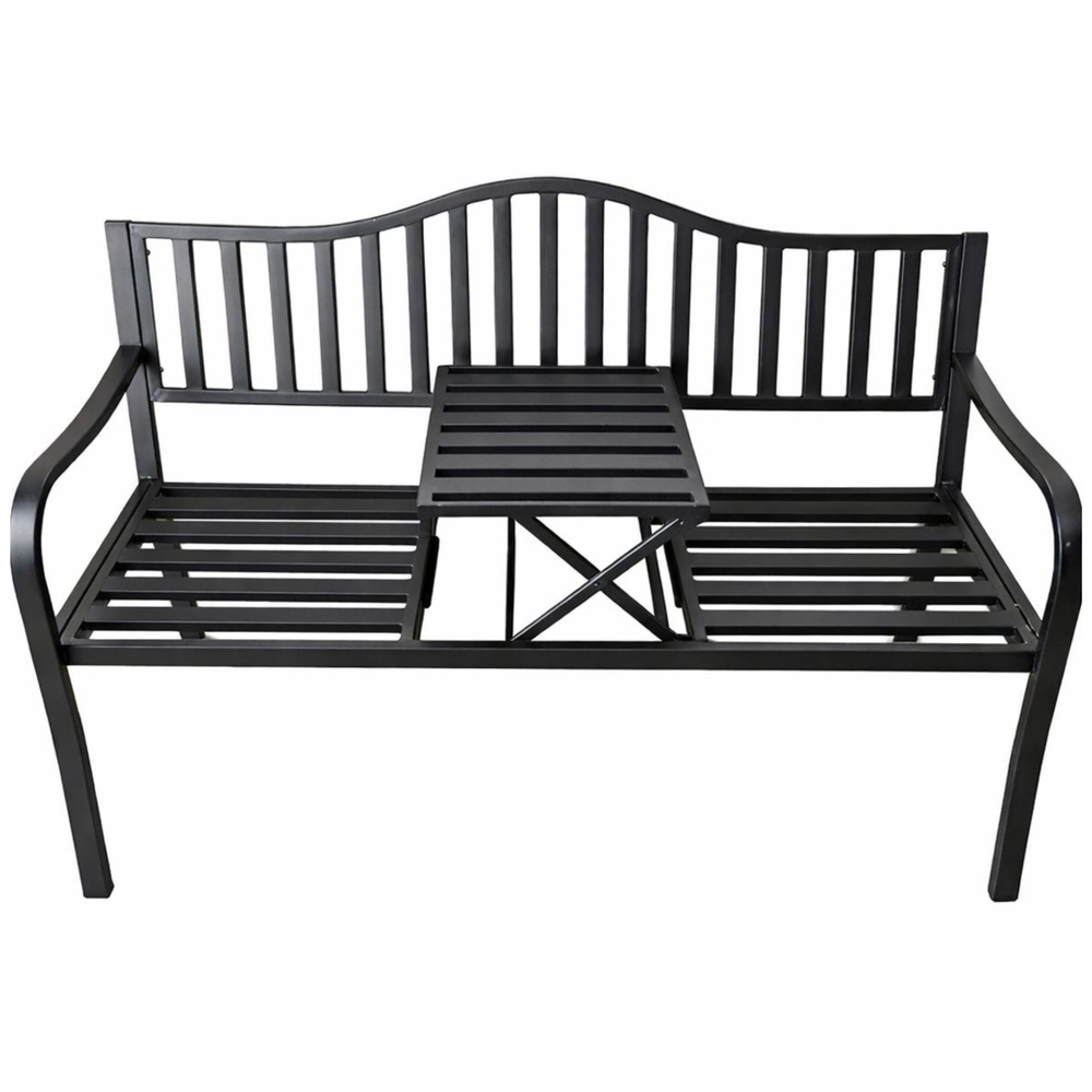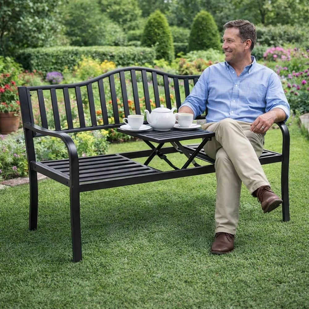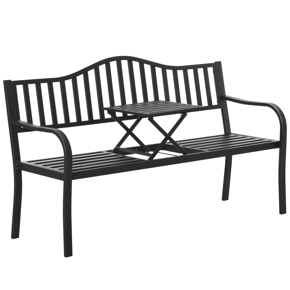 Elegantní kovová zahradní lavička v černé barvě nabízí pohodlné sezení pro tři osoby a praktický sklopný stoleček uprostřed. Díky odolné kovové konstrukci je vhodná na zahradu, terasu i balkon, zatímco lišty sedáku a opěrky zajišťují odvod vody a lepší cirkulaci vzduchu. Ideální pro relax na čerstvém vzduchu i posezení s přáteli.