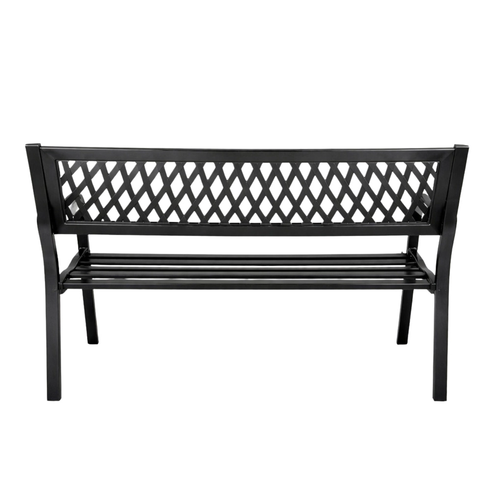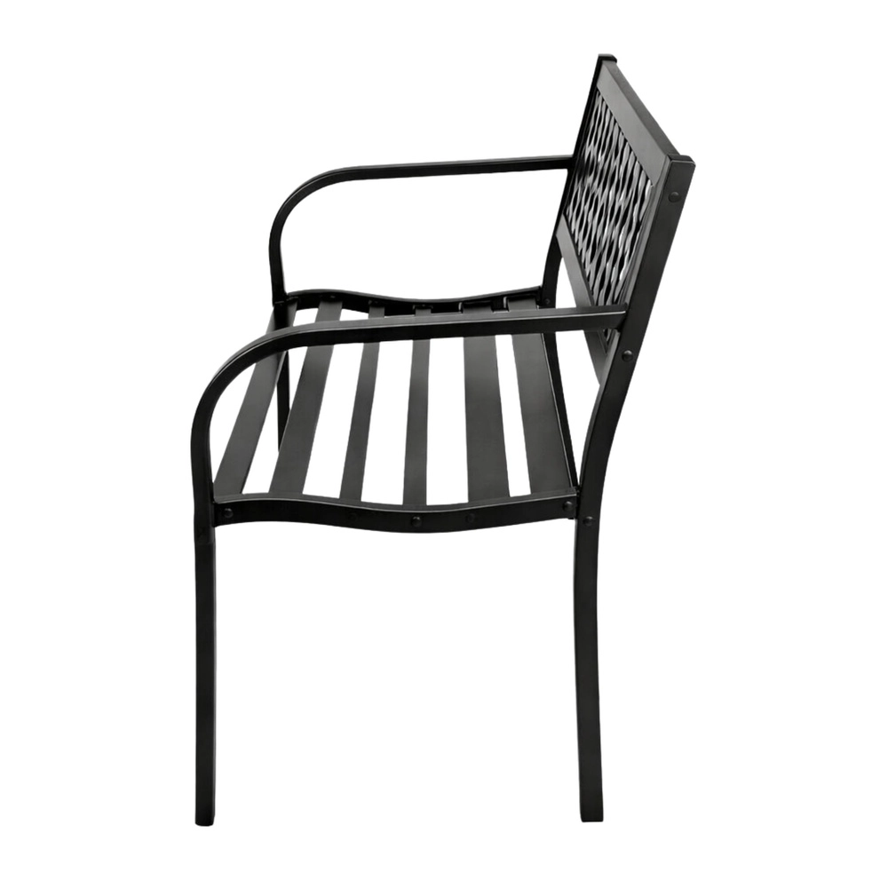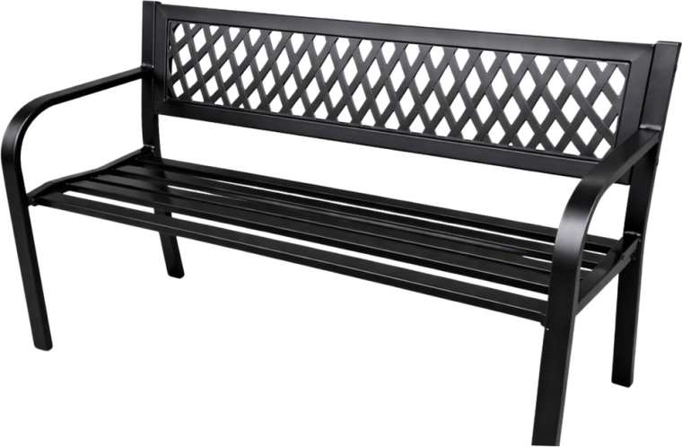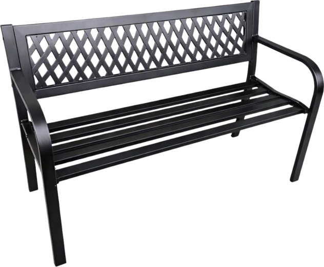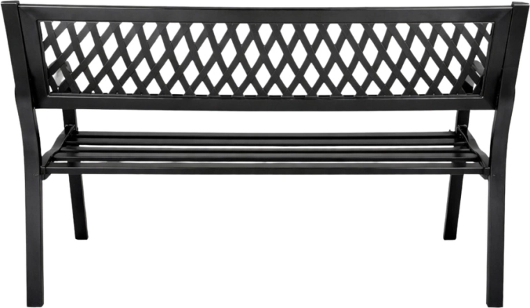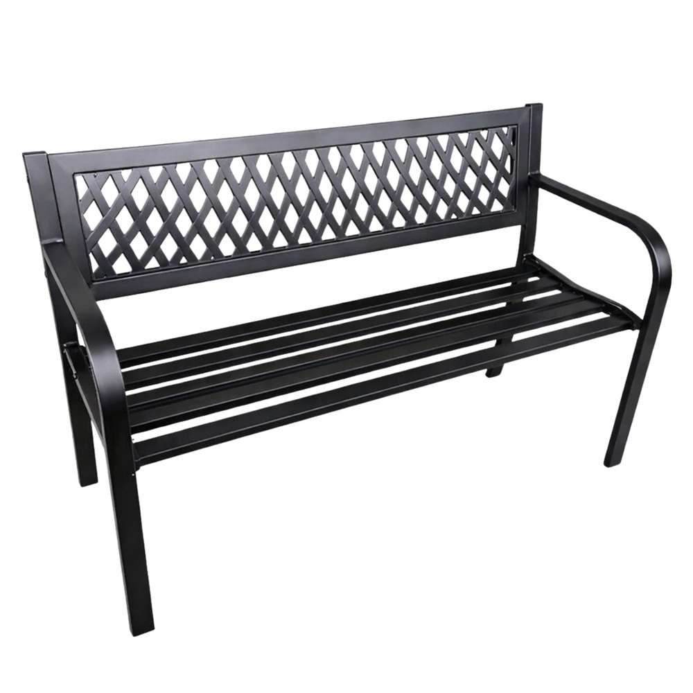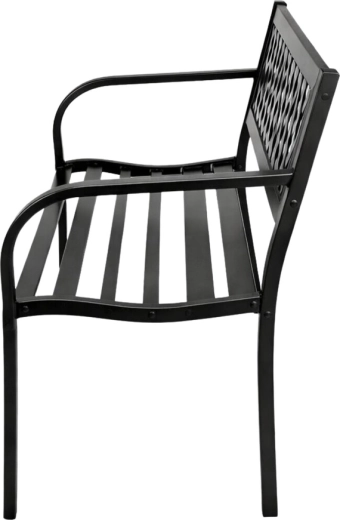 Elegantní kovová zahradní lavice v univerzální černé barvě dodá styl terase, zahradě i balkonu. Odolná ocelová konstrukce s antikorozní práškovou úpravou zvládne déšť, slunce i vítr. Ergonomické sedadlo, pohodlné opěradlo s dekorativní mřížkou a oblá područka zajistí komfort pro 2–3 osoby.