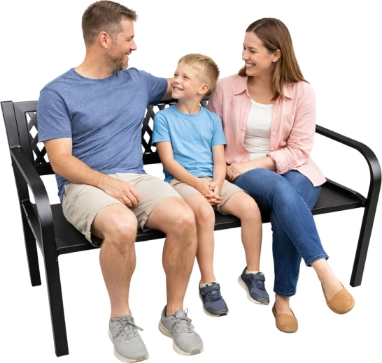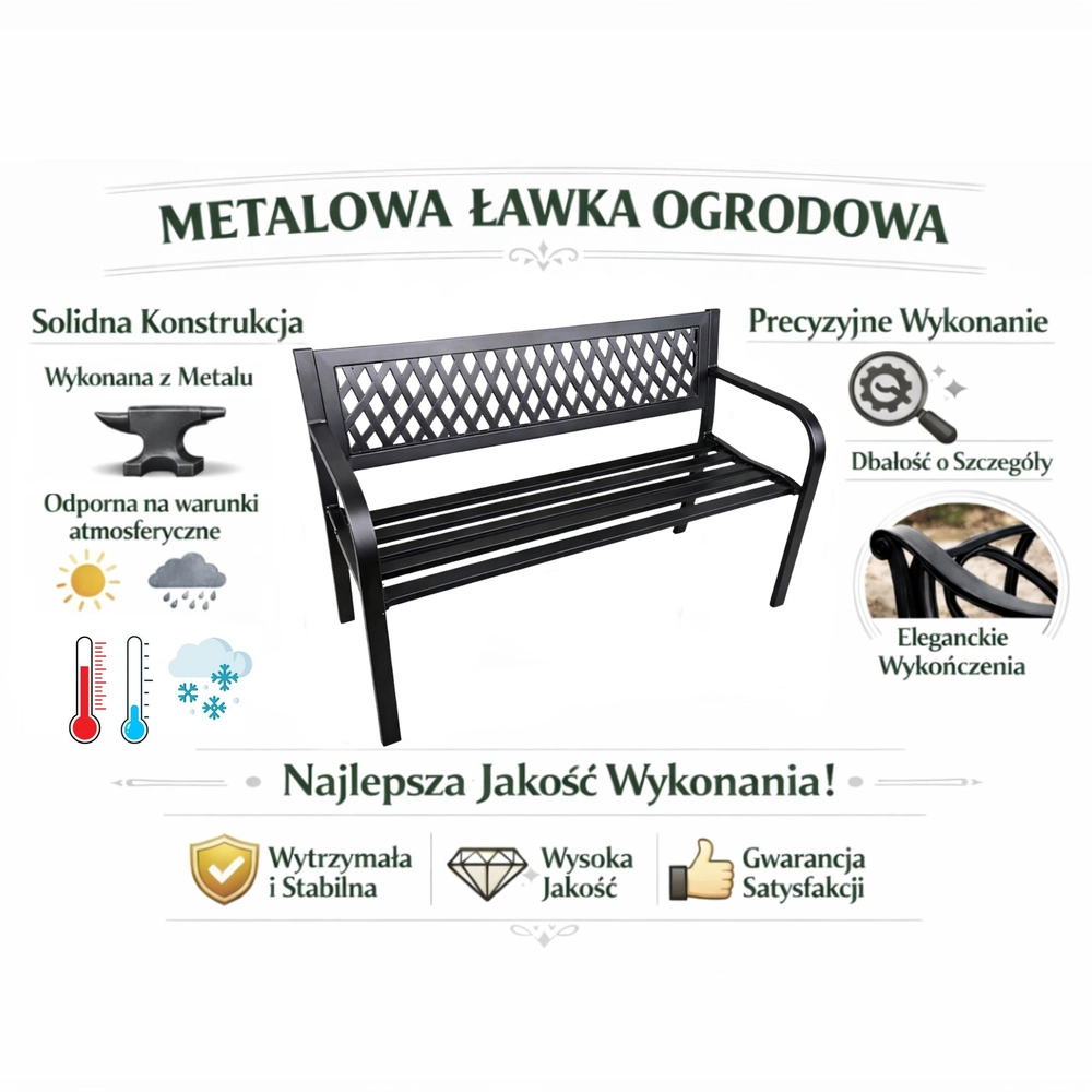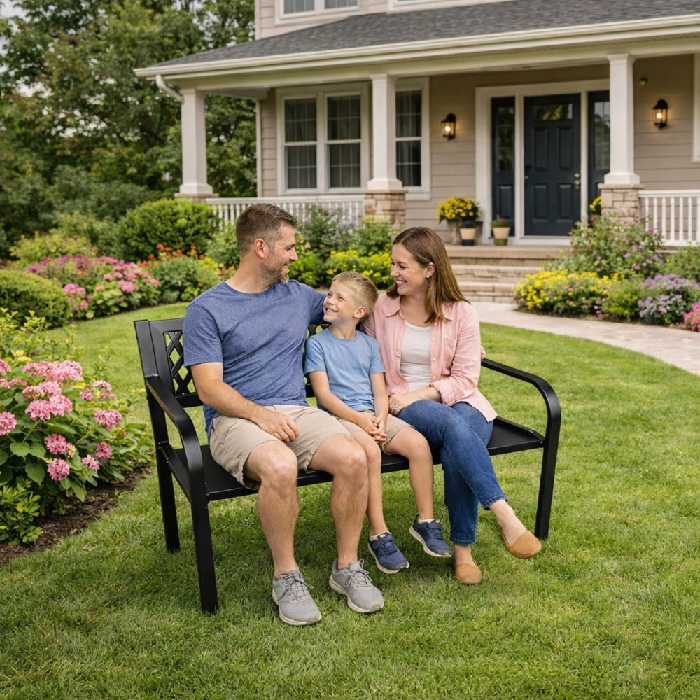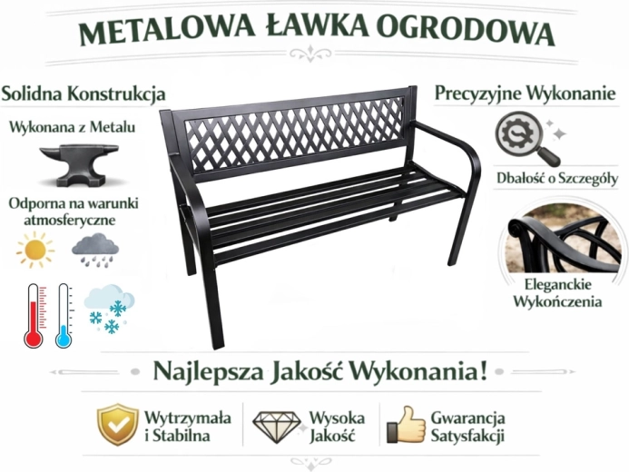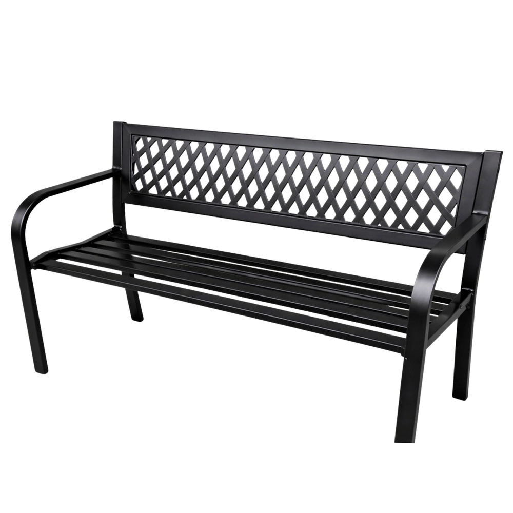 Elegantní kovová zahradní lavice v univerzální černé barvě dodá styl terase, zahradě i balkonu. Odolná ocelová konstrukce s antikorozní práškovou úpravou zvládne déšť, slunce i vítr. Ergonomické sedadlo, pohodlné opěradlo s dekorativní mřížkou a oblá područka zajistí komfort pro 2–3 osoby.