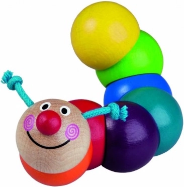 Barevná dřevěná housenka z korálků navlečených na gumičce podporuje rozvoj jemné motoriky už od 6 měsíců. Je zdravotně nezávadná, splňuje normy EU a díky kompaktní délce 13 cm se skvěle drží i v malých ručičkách.