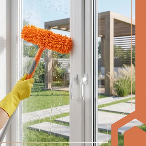 Nejprve uvolníte nečistoty měkkým mikrovláknem, poté setřete vodu gumovou stěrkou pro křišťálově čistý výsledek.