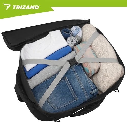 Lehký a praktický cestovní batoh TRIZAND o objemu 20 l a rozměrech 40 × 25 × 20 cm je ideální jako malé palubní zavazadlo. Nabízí otevírání jako kufr, hydrofobní tkaninu Oxford 300D, ukrytou antikrádežní kapsu a režim 2v1 – batoh nebo taška přes rameno. Díky pásku pro uchycení na kufr, dvojitému zipu a kompresním popruhům se sbalíte rychle, přehledně a pohodlně.