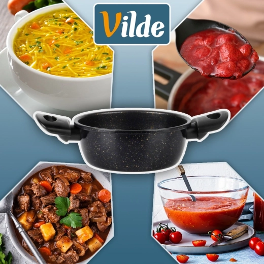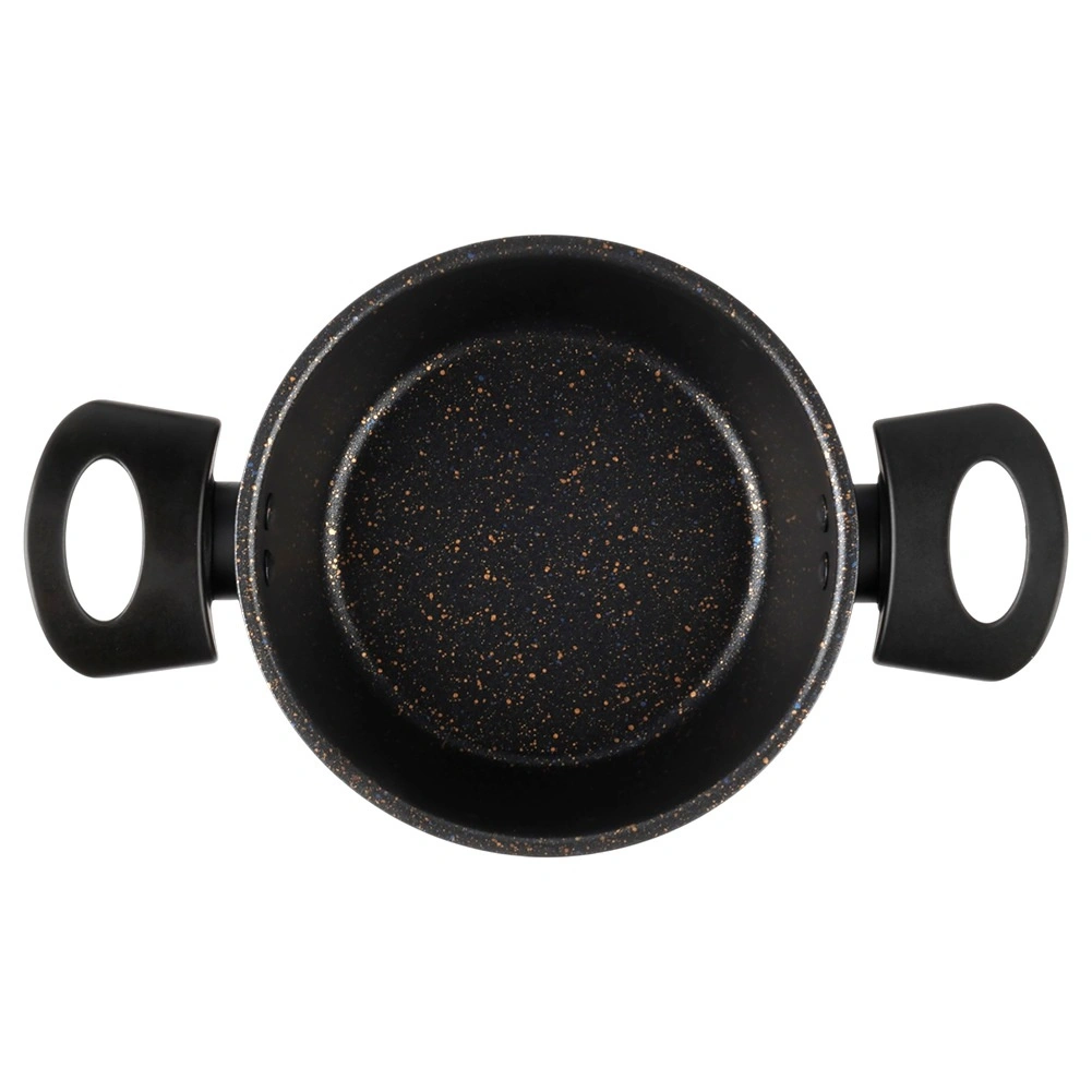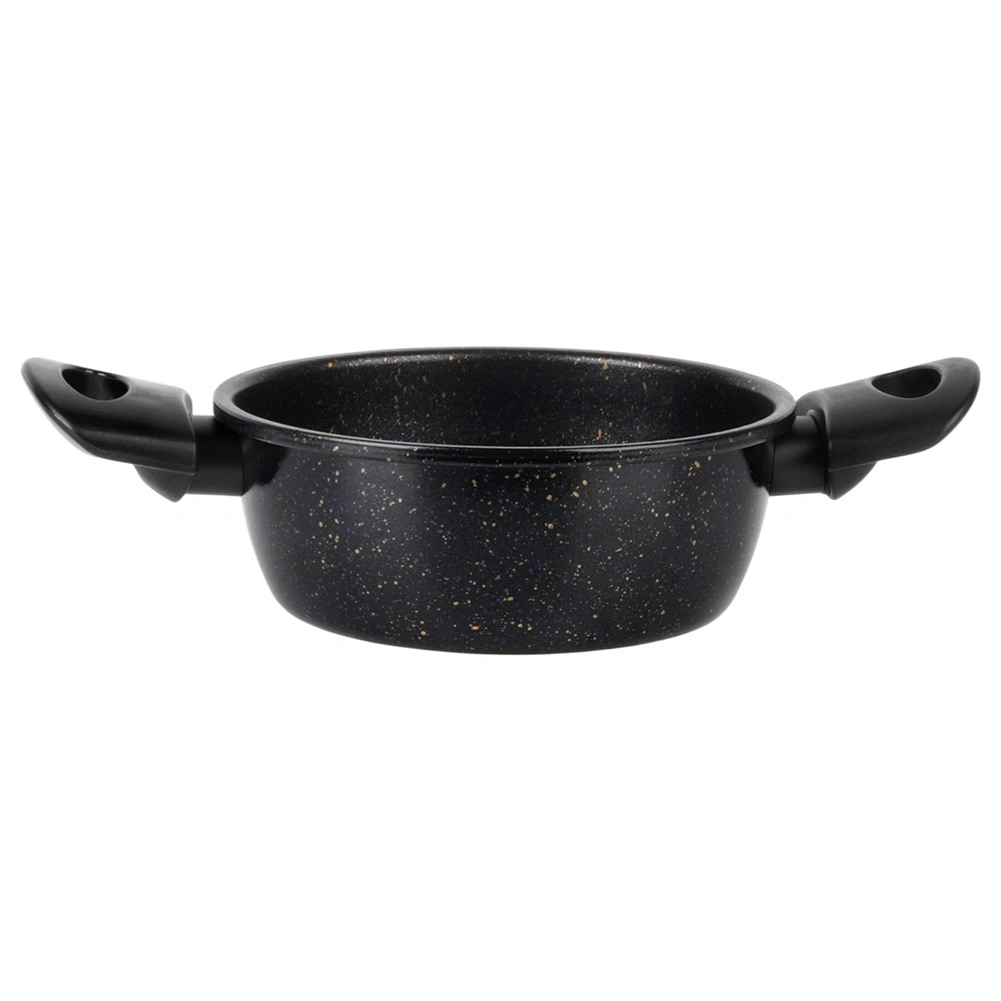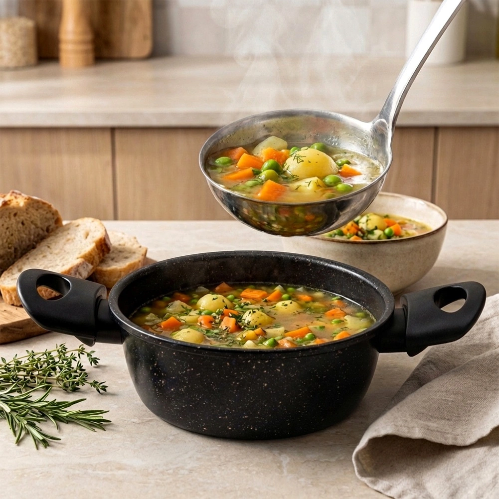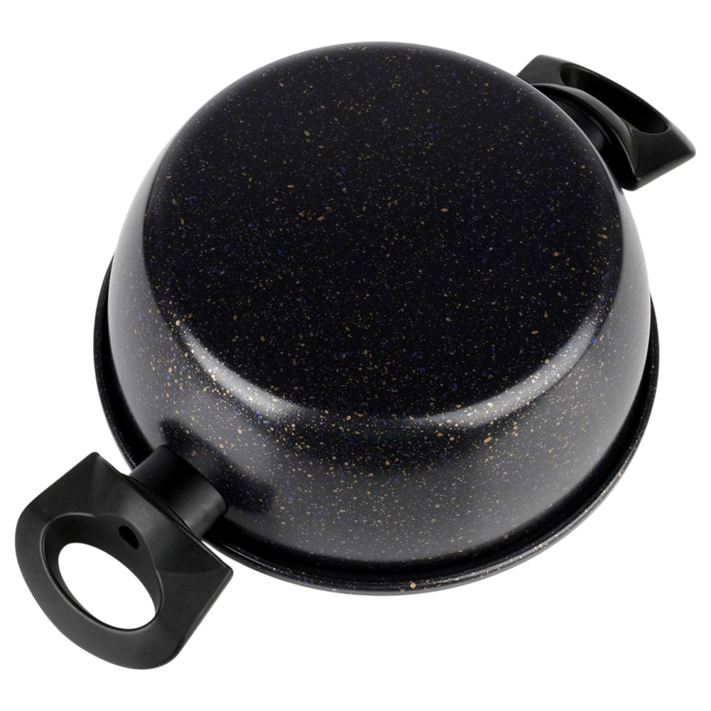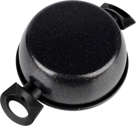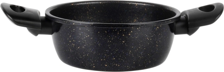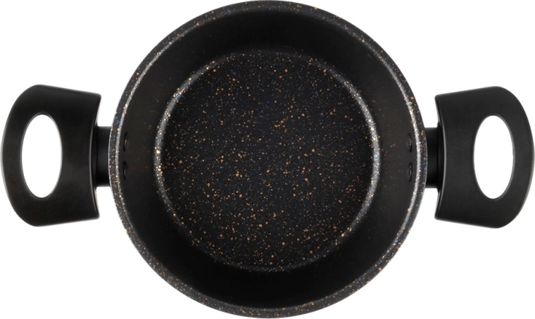 Praktický hrnec s nepřilnavou granitovou povrchovou úpravou usnadní přípravu polévek, omáček i zeleniny. Tělo ze silné uhlíkové oceli rovnoměrně rozvádí teplo, povrch s kamenným efektem minimalizuje připékání a zkracuje úklid. Ergonomické boční rukojeti z odolného plastu zpříjemní přenášení z plotny na stůl.