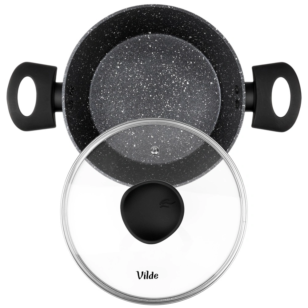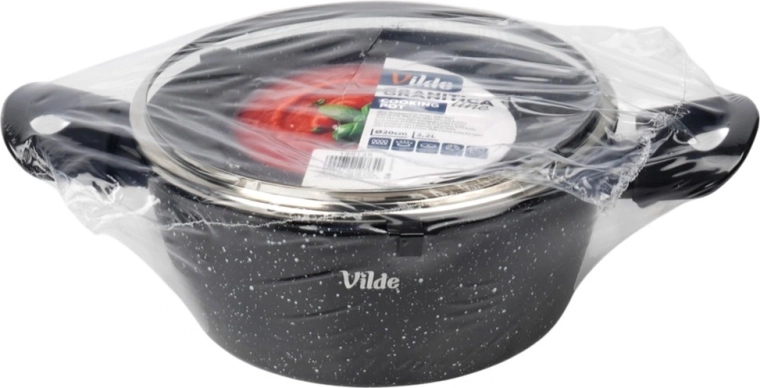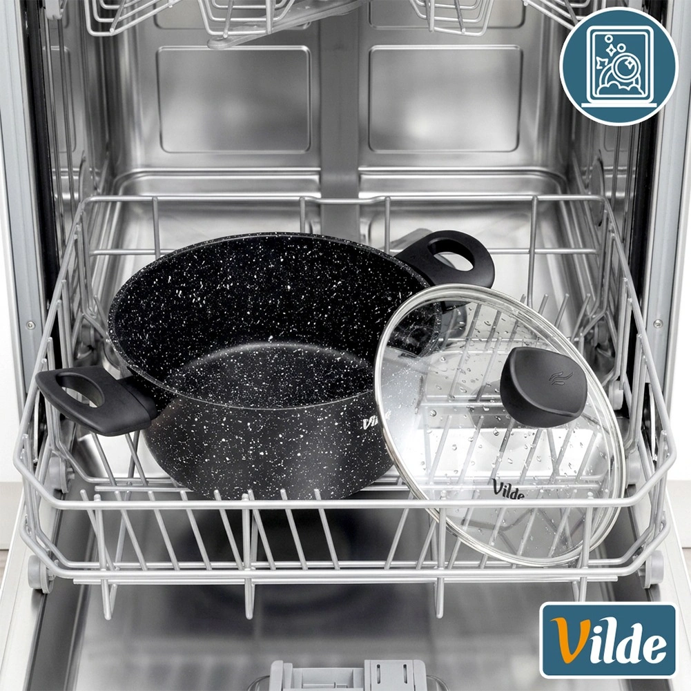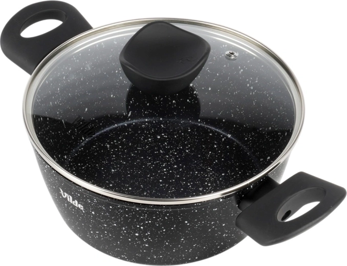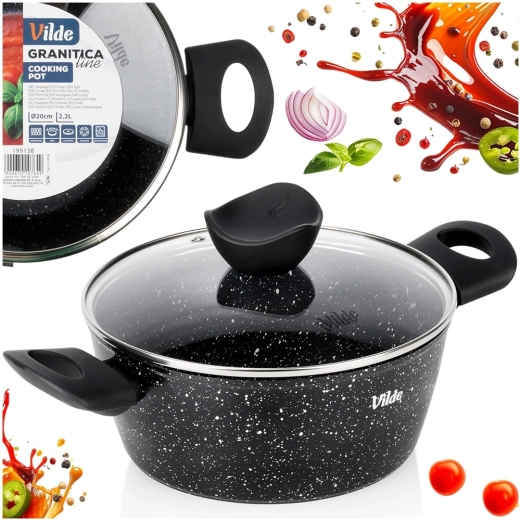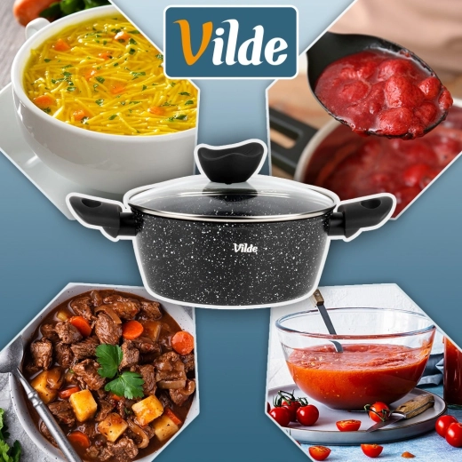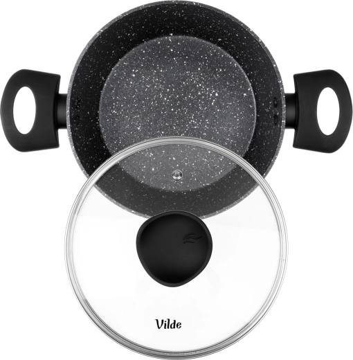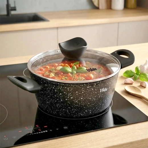 VILDE Granitica Line přináší kombinaci trvanlivosti a pohodlí. Nepřilnavý granitový povrch zabraňuje připalování, skleněná poklice s parním ventilem usnadňuje kontrolu vaření a ergonomické rukojeti s povrchem soft touch zvyšují bezpečnost i komfort při manipulaci.