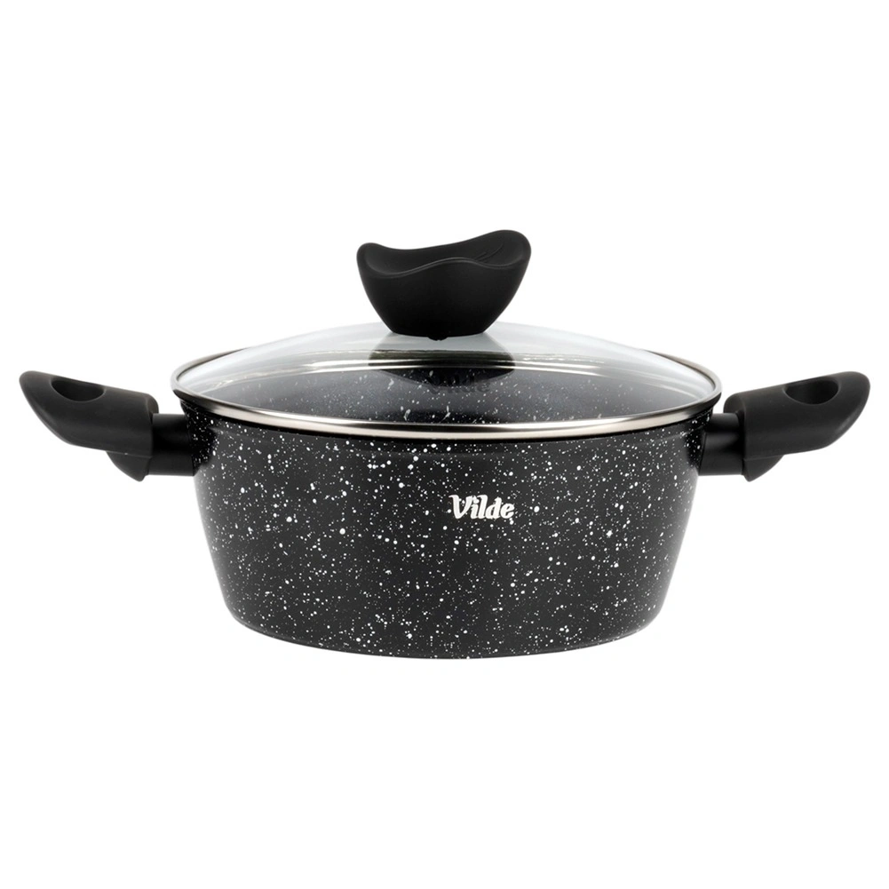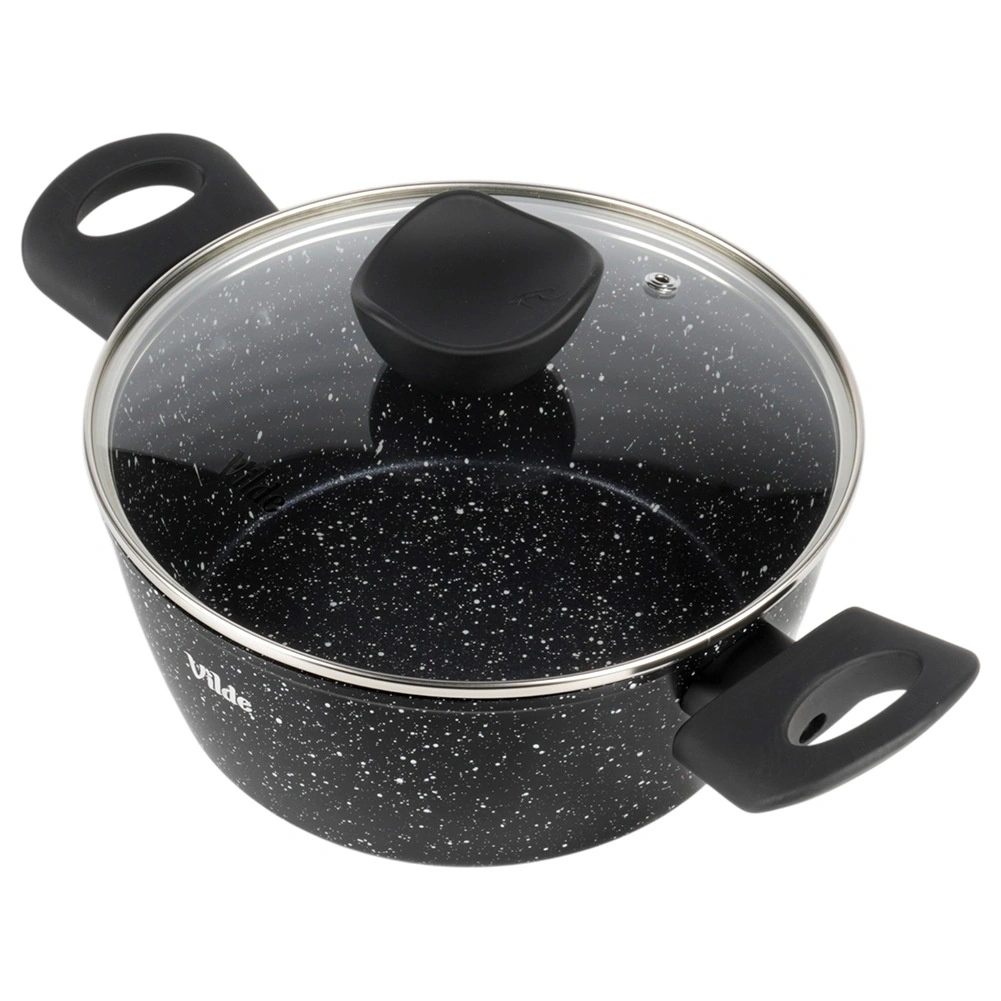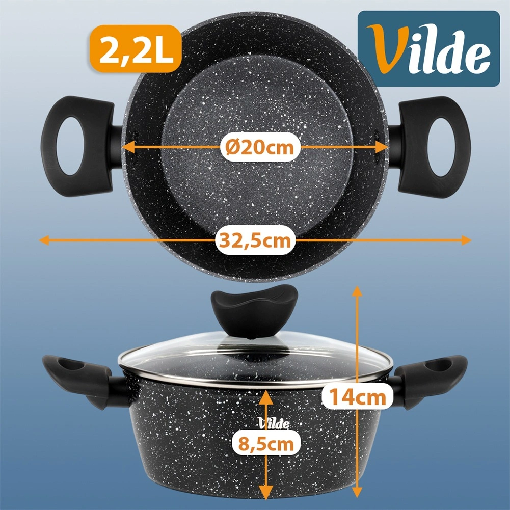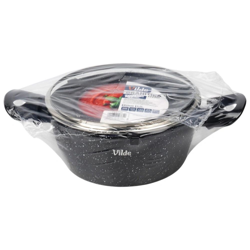 VILDE Granitica Line přináší kombinaci trvanlivosti a pohodlí. Nepřilnavý granitový povrch zabraňuje připalování, skleněná poklice s parním ventilem usnadňuje kontrolu vaření a ergonomické rukojeti s povrchem soft touch zvyšují bezpečnost i komfort při manipulaci.