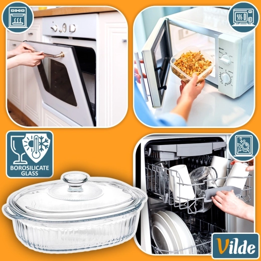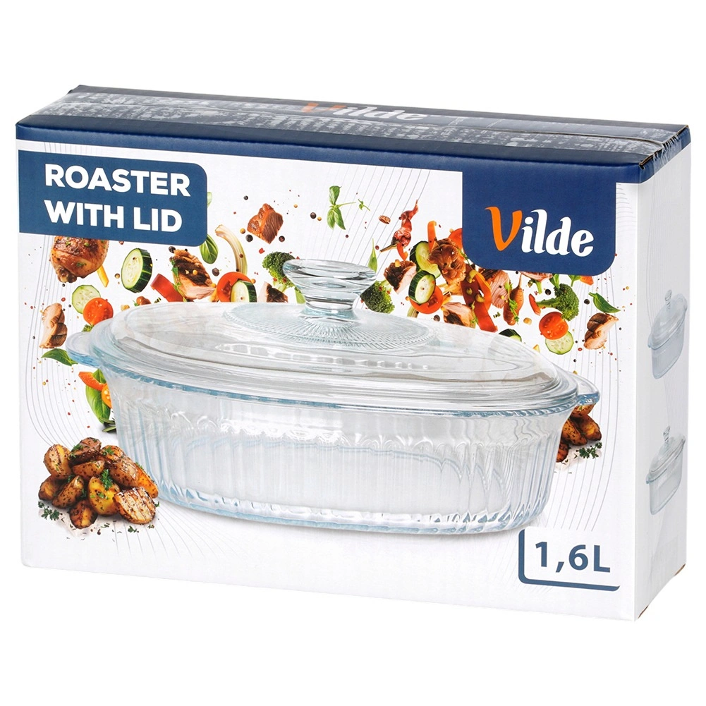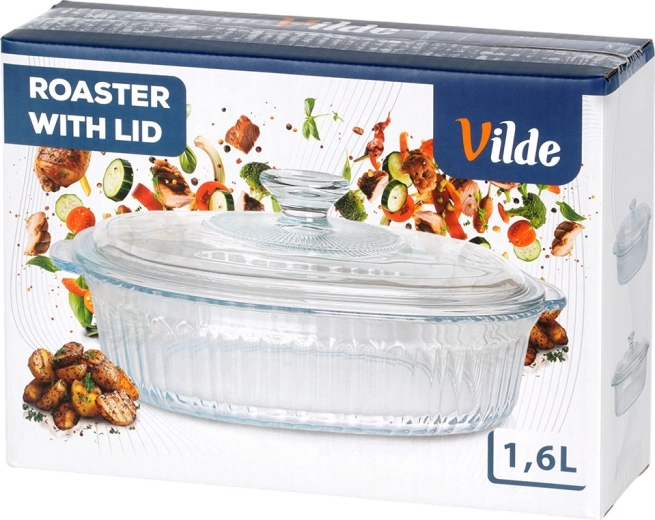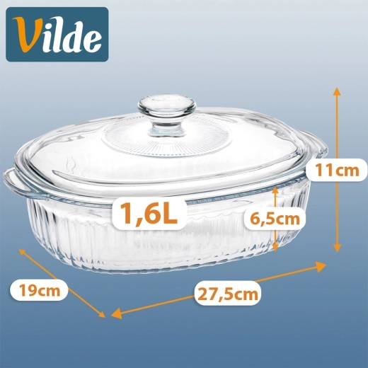 Rozměry s víkem: 27,5 × 19 × 11 cm, výška mísy bez víka: 6,5 cm, objem: 1,6 l. Sklo je odolné v rozmezí -30 °C až +400 °C, takže se hodí do trouby, mikrovlnky, chladničky i mrazničky. Víko pomáhá udržet vlhkost a teplo, úchyty usnadňují manipulaci.